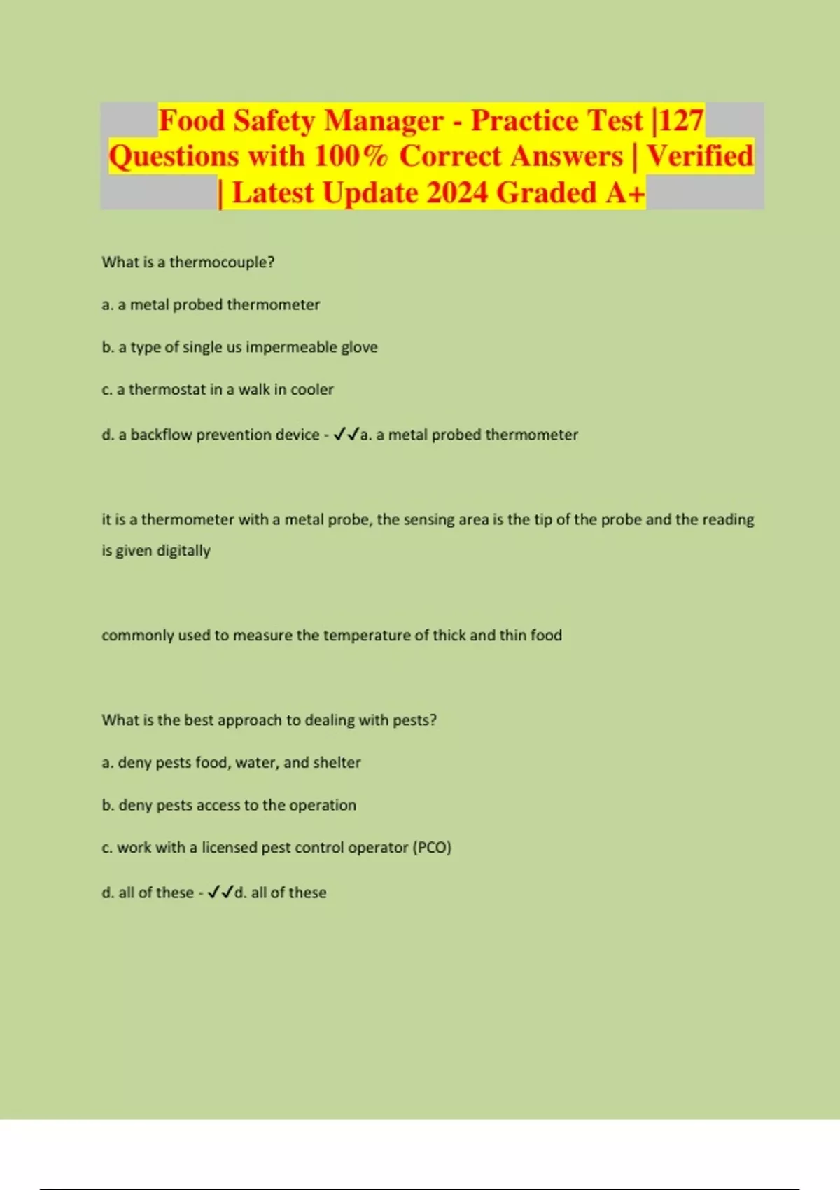 Food Safety Manager - Practice Test |127 Questions with 100% Correct Answers | Verified | Latest Update 2024 Graded A+