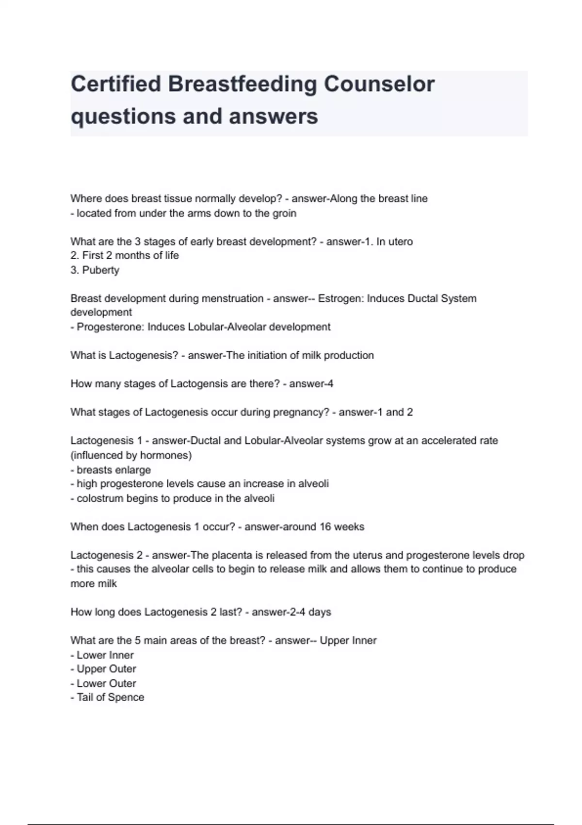 Certified Breastfeeding Counselor questions and answers Where does breast tissue normally develop? - answer-Along the breast line - located from under the arms down to the groin What are the 3 stages of early breast development? - answer-1. In utero 2. First 2 months of life 3. Puberty Breast development during menstruation - answer-- Estrogen: Induces Ductal System development - Progesterone: Induces Lobular-Alveolar development What is Lactogenesis? - answer-The initiation of milk production How many stages of Lactogensis are there? - answer-4 What stages of Lactogenesis occur during pregnancy? - answer-1 and 2
