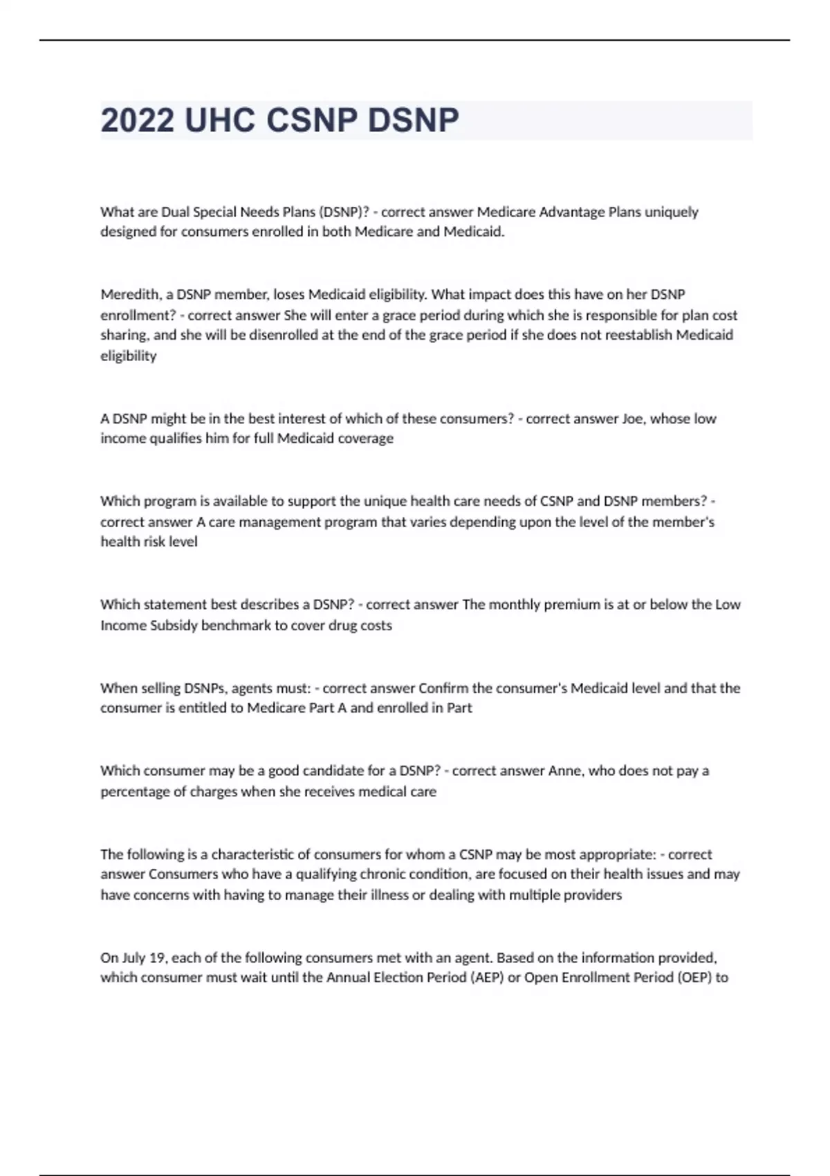 2022 UHC CSNP DSNP Questions with complete solution(UPDATED)What are Dual Special Needs Plans (DSNP)? - correct answer Medicare Advantage Plans uniquely designed for consumers enrolled in both Medicare and Medicaid. Meredith, a DSNP member, loses Medicaid eligibility. What impact does this have on her DSNP enrollment? - correct answer She will enter a grace period during which she is responsible for plan cost sharing, and she will be disenrolled at the end of the grace period if she does not reestablish Medicaid eligibility A DSNP might be in the best interest of which of these consumers? - correct answer Joe, whose low income qualifies him for full Medicaid coverage Which program is available to support the unique health care needs of CSNP and DSNP members? - correct answer A care management program that varies depending upon the level of the member's health risk level Which statement best describes a DSNP? - correct answer The monthly premium is at or below the Low Income Subsidy benchmark to cover drug costs When selling DSNPs, agents must: - correct answer Confirm the consumer's Medicaid level and that the consumer is entitled to Medicare Part A and enrolled in Part Which consumer may be a good candidate for a DSNP? - correct answer Anne, who does not pay a percentage of charges when she receives medical care
