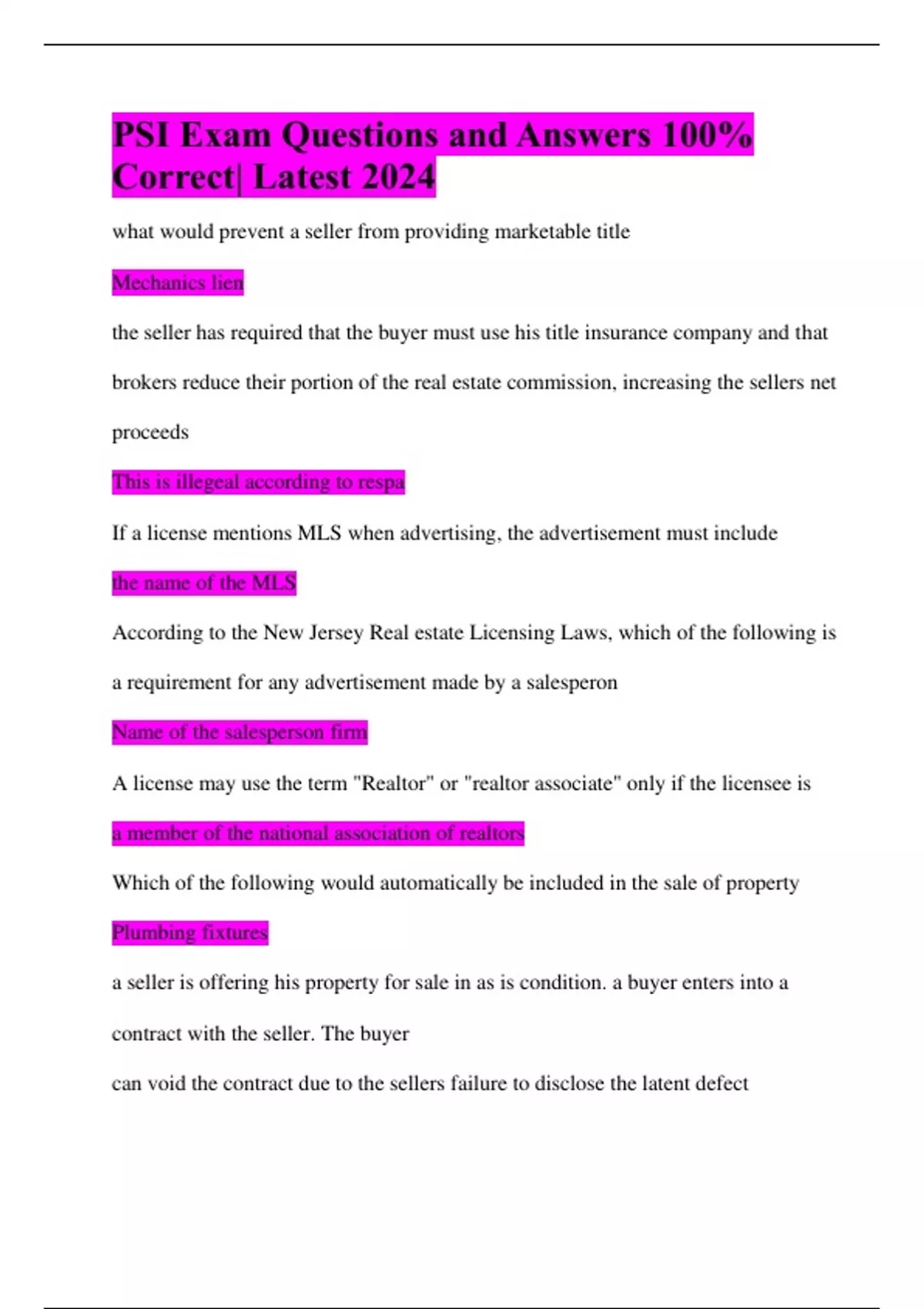 PSI Exam Questions and Answers 100% Correct| Latest 2024 what would prevent a seller from providing marketable title Mechanics lien the seller has required that the buyer must use his title insurance company and that brokers reduce their portion of the real estate commission, increasing the sellers net proceeds This is illegeal according to respa If a license mentions MLS when advertising, the advertisement must include the name of the MLS According to the New Jersey Real estate Licensing Laws, which of the following is a requirement for any advertisement made by a salesperon Name of the salesperson firm A license may use the term "Realtor" or "realtor associate" only if the licensee is a member of the national association of realtors Which of the following would automatically be included in the sale of property Plumbing fixtures a seller is offering his property for sale in as is condition. a buyer enters into a contract with the seller. The buyer can void the contract due to the sellers failure to disclose the latent defect Maintains a real estate agency and terminated two salespersons, in this situation, the broker is required to take all the following steps except Permit them to remove original sales and listing contracts from the brokers office What should buyers insert into the purchase offer to make sure they would not have to go through with the purchase if they are not met contingencies A potential buyer signs a contract with a seller but then decides not to buy. The seller may sue the potential buyer for specific preformance because the contract was a bilateral contract Standard title insurance policy would protect a buyer When the seller has forged his ex-wife's signature on the deed Under New Jersey Real Estate commission rules, a licensee's obligations to the public include all of the following except Accepting any reasonable commission offered by a seller in the course of negotiating a listing agreement When operating in a discloses dual agency relationship, a licensee must disclose the Buyer being laid-off after submitting a mortgage application A land contract is sometimes known as