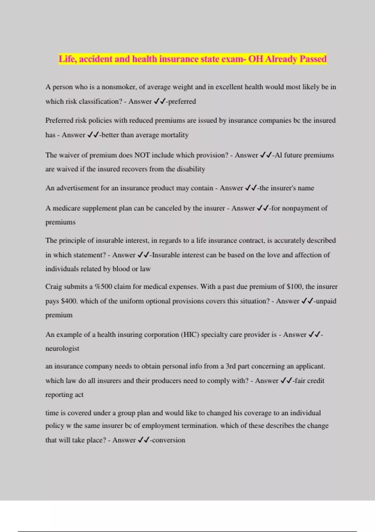 Life, accident and health insurance state exam- OH Already Passed A person who is a nonsmoker, of average weight and in excellent health would most likely be in which risk classification? - Answer ️️ -preferred Preferred risk policies with reduced premiums are issued by insurance companies bc the insured has - Answer ️️ -better than average mortality The waiver of premium does NOT include which provision? - Answer ️️ -Al future premiums are waived if the insured recovers from the disability An advertisement for an insurance product may contain - Answer ️️ -the insurer's name A medicare supplement plan can be canceled by the insurer - Answer ️️ -for nonpayment of premiums The principle of insurable interest, in regards to a life insurance contract, is accurately described in which statement? - Answer ️️ -Insurable interest can be based on the love and affection of individuals related by blood or law Craig submits a %500 claim for medical expenses. With a past due premium of $100, the insurer pays $400. which of the uniform optional provisions covers this situation? - Answer ️️ -unpaid premium An example of a health insuring corporation (HIC) specialty care provider is - Answer ️️ - neurologist an insurance company needs to obtain personal info from a 3rd part concerning an applicant. which law do all insurers and their producers need to comply with? - Answer ️️ -fair credit reporting act time is covered under a group plan and would like to changed his coverage to an individual policy w the same insurer bc of employment termination. which of these describes the change that will take place? - Answer ️️ -conversion an agents appt has been terminated by insurer. the insurer must then notify the superintendent within how many days of the termination? - Answer ️️ -30 the suicide clause of a life insurance policy states that if an insured commits suicide w in a stated period from the policy inception, the insurer will only be liable for a return of prisms paid - Answer ️️ -minus indebtedness and without interest which of the following is considered to be an alternative to a life settlement? - Answer ️️ - accelerated death benefit rider if the annuitant dies before the annuity start date, - Answer ️️ -the premiums paid plus interest earned will be given to the beneficiary a life insurance policy that has premiums fully paid up within a stated time period is called - Answer ️️ -limited payment insurance shopping for annuity that guarantees he cannot outlive the benefits. which of these benefit options would he choose - Answer ️️ -guaranteed lifetime withdrawal benefit what is medicare part b known as - Answer ️️ -supplementary medical insurance field underwriting performed by the producer involves - Answer ️️ -completing the application and collecting initial premium a life insurance policy which contains cash values that vary according to its investment performance of stocks is called - Answer ️️ -variable whole life a life insurance policy owner was injured in an automobile accident which results in total and permanent disability. which rider would pay a monthly amount bc of this disability? - Answer ️️ -disability income rid