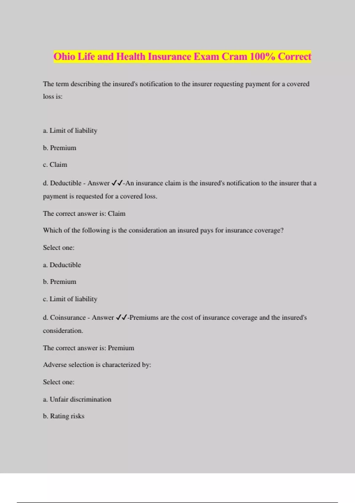 Ohio Life and Health Insurance Exam Cram 100% Correct The term describing the insured's notification to the insurer requesting payment for a covered loss is: a. Limit of liability b. Premium c. Claim d. Deductible - Answer ️️ -An insurance claim is the insured's notification to the insurer that a payment is requested for a covered loss. The correct answer is: Claim Which of the following is the consideration an insured pays for insurance coverage? Select one: a. Deductible b. Premium c. Limit of liability d. Coinsurance - Answer ️️ -Premiums are the cost of insurance coverage and the insured's consideration. The correct answer is: Premium Adverse selection is characterized by: Select one: a. Unfair discrimination b. Rating risks c. A healthy person purchasing health insurance d. A sick person purchasing health insurance - Answer ️️ -Adverse selection is the tendency for poorer than average risks to seek insurance. The correct answer is: A sick person purchasing health insurance Judith is injured in a car accident. She incurs a covered loss of $50,000. She is required to pay $3,000 before the insurer will cover 80% of the covered loss. Which of the following terms best describes the $3,000 Judith must pay? a. Premium b. Deductible c. Coinsurance d. Claim - Answer ️️ -A deductible is the amount an insured must pay before the insurer will begin to pay benefits. The correct answer is: Deductible Judith's health insurance will pay a maximum of $3 million for all of her claims. Which of the following terms best describes this policy feature? Select one: a. Indemnity b. Limit of liability c. Coinsurance d. Claim - Answer ️️ -A limit of liability is the total amount the insurer will pay for an insured risk. The correct answer is: Limit of liability The tendency for poorer than average risks to seek out insurance is the definition of: Select one: a. Indemnity b. Reinsurance c. Adverse selection d. Coinsurance - Answer ️️ -Insurers must minimize adverse selection, which is defined as the tendency for poorer than average risks to seek out insurance. The correct answer is: Adverse selection Cost-sharing between the insurer and the insured that is often expressed as the percent for insurer and insured is known as: Select one: a. Coinsurance b. Deductible c. Premium d. Claim - Answer ️️ -Coinsurance is the cost-sharing between the insurer and the insured. It is usually expressed as the percent for insurer and insured, such as 80/20. The correct answer is: Coinsurance Which of the following types of insurance covers a debt? Select one: a. Credit b. Casualty c. Property d. Legal liability - Answer ️️ -Credit insurance is used to protect against the risk of inability to repay a debt. Property, casualty and legal liability do not cover debts. The correct answer is: Credit Reinsurance is defined as: Select one: a. Risk reduction b. Spreading risk from one insurer to another c. To make whole d. Adverse selection - Answer ️️ -Your answer is correct When an insurer incurs too much loss, it can spread risk to another insurer. The correct answer is: Spreading risk from one insurer to another This product protects against the risk of living too long: Select one: a. Life insurance b. Health insurance c. Annuities d. Variable life insurance - Answer ️️ -Annuities protect against the risk of living too long. The correct answer is: Annuities Which of the following correctly identifies the most importa