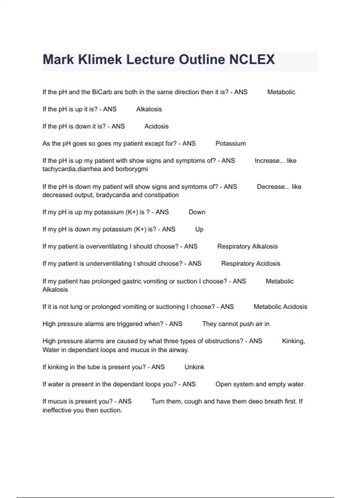 Mark Klimek Lecture Outline NCLEX If the pH and the BiCarb are both in the same direction then it is? - ANS Metabolic If the pH is up it is? - ANS Alkalosis If the pH is down it is? - ANS Acidosis As the pH goes so goes my patient except for? - ANS Potassium If the pH is up my patient with show signs and symptoms of? - ANS Increase... like tachycardia,diarrhea and borborygmi If the pH is down my patient will show signs and symtoms of? - ANS Decrease... like decreased output, bradycardia and constipation If my pH is up my potassium (K+) is ? - ANS Down If my pH is down my potassium (K+) is? - ANS Up If my patient is overventilating I should choose? - ANS Respiratory Alkalosis If my patient is underventilating I should choose? - ANS Respiratory Acidosis If my patient has prolonged gastric vomiting or suction I choose? - ANS Metabolic Alkalosis If it is not lung or prolonged vomiting or suctioning I choose? - ANS Metabolic Acidosis High pressure alarms are triggered when? - ANS They cannot push air in High pressure alarms are caused by what three types of obstructions? - ANS Kinking, Water in dependant loops and mucus in the airway. If kinking in the tube is present you? - ANS Unkink If water is present in the dependant loops you? - ANS Open system and empty water. If mucus is present you? - ANS Turn them, cough and have them deeo breath first. If ineffective you then suction. Low pressure alarms are triggered when? - ANS It is to easy to push air in. Low pressure alarms are normally caused by? - ANS Disconnection If the tubing is disconnected you? - ANS Reconnect If O2 sensor line is disconnected you? - ANS Reconnect In a vented client respiratory alkalosis means the vent setting may be too? - ANS High In a vented client respiratory acidosis means the vent may be too? - ANS Low What do you do if the patients disconnected tube is on the floor? - ANS Bag them, (call for help) get new tube and then reconnect. What do you do if the patients disconnected tube is on the chest? - ANS Reconnect ... if its above the waist its ok. What is the biggest problem in abuse? - ANS Denial To treat denial you need to? - ANS Confront How do you confront? - ANS Point out the difference between what they say and what they do. What is the one circumstance that you as a nurse would support denial? - ANS Loss and Grief What is dependency? - ANS When the abuser gets a significant other so make decisions for them or do thing for them. What is codependency? - ANS When the significant other gets positive self esteem from doing things or making decisions for an abuser. To treat dependency/codependency you ? - ANS Set limits and enforce them. You also need to work or the self estreem of the codependent. What is manipulation? - ANS When the abuser gets the significant other fo do things for them that is not in the best interest of the significant other. This can be dangerous and harmful to the significant other. How do you treat manipulation? - ANS Set limits and enforce. Why is manipulation easier to treat then dependency/codependency? - ANS Because no one likes being manipulated. What is Wernickes (Korsakoffs) Syndrome? - ANS Psychosis induced by vitamin B1 (Thiamine) deficiency. Vitamin B1 helps breakdown? - ANS Alcohol Primary symptom of Wernickes? - ANS Amnesia with confabulation (making up stories). Is Wernickes preventable? - ANS Yes Is Wernickes arrestable? - ANS Yes Is Wernickes reversible? - ANS No What is aversion therapy? - ANS When you try and make the patient hate something. Antabuse onset and duration is? - ANS 2 weeks Teach a patient taking Antabuse to avoid what? - ANS Alochol On top of alcohol a patient taking Antabuse should also avoid what other 7 things? - ANS Elixirs, Vanilla Extract, Aftershave/Perfumes, Alcohol based hand sanitizer, Insect repellant, Mouthwash and Vinagerette. What are the five uppers? - ANS Caffeine, Cocaine, Methamphetamines, PCP/LSD and ADHD Meds Downers are? - ANS Everything other then the five uppers. S/S of upper use? - ANS Everything goes up...Tachycardia, increased BP etc. S/S of downer use? - ANS Everything goes down...Bradycardia, decreased BP etc. Overdose of a downer causes everything to go? - ANS Down Overdose of an upper causes everything to go? - ANS Up Withdrawal of an upper causes everything to go? - ANS Down Withdrawal of a downer causes everything to go? - ANS Up At birth if the mother was addicted to a substance always assume the newborn is in? - ANS Intoxication If 24 hours after birth assume the baby is in? - ANS Withdrawal Every alcoholic goes through what withing 24 hours after cessation? - ANS Withdrawal syndrome After 72 hours of alochol withdrawal a small minority may get? - ANS Delirium Tremens Can Delirium Tremens kill you? - ANS Yes Can Alcohol Withdrawal Syndrome kill you? - ANS No Are patients with Alcohol Withdrawal Syndrome a danger to themselves or others? - ANS No Are patients with Delirium Tremens a danger to themselves or others? - ANS Yes N/I for Delirium Tremens? - ANS Private room near nurses station, NPO/Clear liquids, Restricted bed rest, restraints, tranquilizer, multivitamin (B1 vit.) and antihypertensive. N/I for Alcohol Withdrawal Syndrome? - ANS Semi-private room anywhere, regular diet, up and ad-lib, no restraint, tranquilizer, multivitamin (B1) and antihypertensive. A two point restraint is? - ANS One arm and the opposite leg. N/I for restraints? - ANS Check Q15min. and rotate sites Q2H All aminoglycosides end in? - ANS "mycin" Vancomycin If it has "thro" in it you? - ANS Throw it out...Zithromycin Toxic effects of aminoglycosides? - ANS Ototoxicity, nephrotoxicity and cranial nerve 8 (vestibulocochlear nerve) which senses sound. In aminoglycoside use monitor? - ANS Hearing, balance, tinnitus & creatinine (best indicator of renal function) Frequency of administration for aminoglycosides? - ANS Q8H Aminoglycoside route of administration? - ANS Im or IV Aminoglycosides are given PO for what two reasons? - ANS Hepatic Encephalopathy a