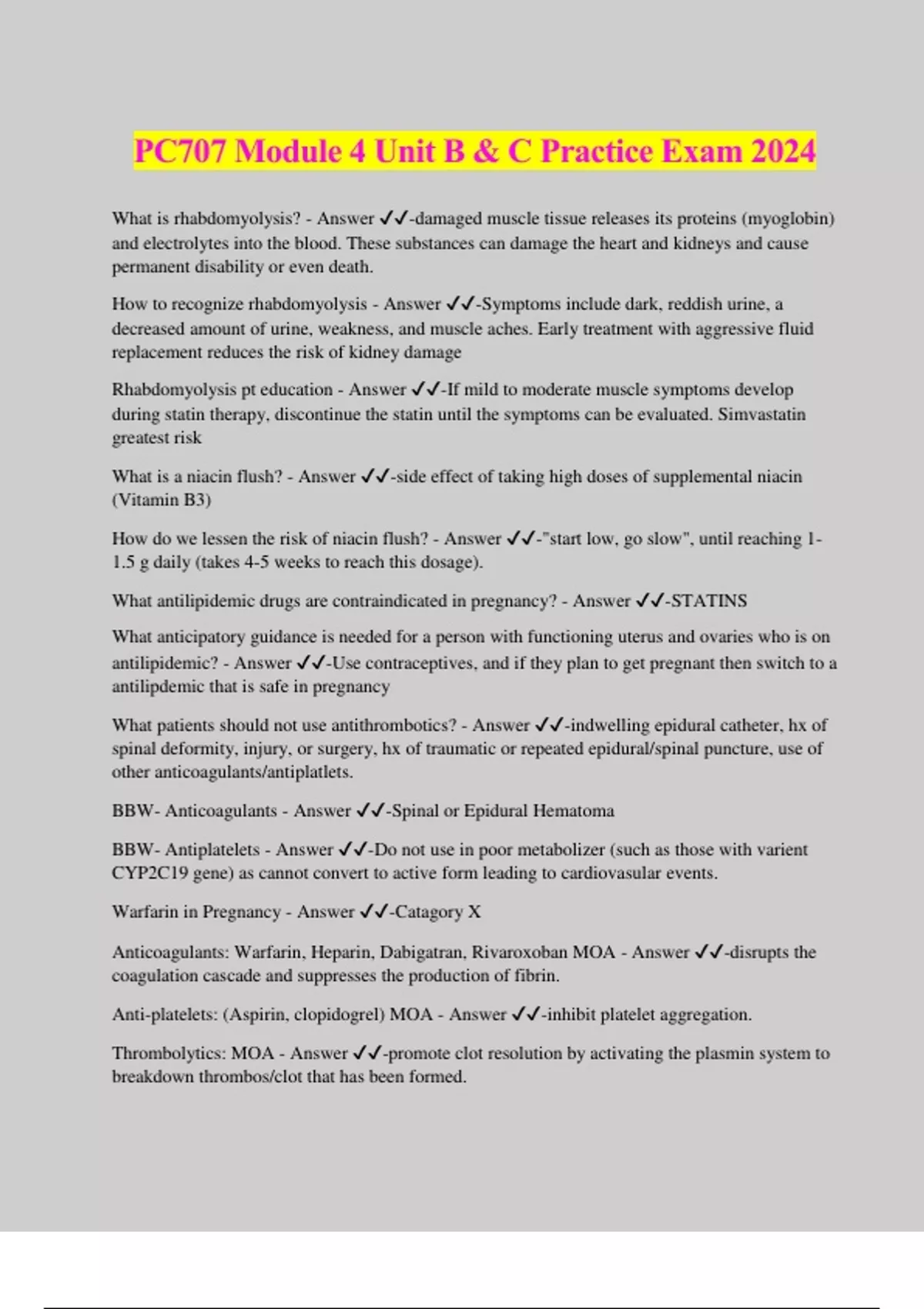 PC707 Module 4 Unit B & C Practice Exam 2024 What is rhabdomyolysis? - Answer ️️ -damaged muscle tissue releases its proteins (myoglobin) and electrolytes into the blood. These substances can damage the heart and kidneys and cause permanent disability or even death. How to recognize rhabdomyolysis - Answer ️️ -Symptoms include dark, reddish urine, a decreased amount of urine, weakness, and muscle aches. Early treatment with aggressive fluid replacement reduces the risk of kidney damage Rhabdomyolysis pt education - Answer ️️ -If mild to moderate muscle symptoms develop during statin therapy, discontinue the statin until the symptoms can be evaluated. Simvastatin greatest risk What is a niacin flush? - Answer ️️ -side effect of taking high doses of supplemental niacin (Vitamin B3) How do we lessen the risk of niacin flush? - Answer ️️ -"start low, go slow", until reaching 1- 1.5 g daily (takes 4-5 weeks to reach this dosage). What antilipidemic drugs are contraindicated in pregnancy? - Answer ️️ -STATINS What anticipatory guidance is needed for a person with functioning uterus and ovaries who is on antilipidemic? - Answer ️️ -Use contraceptives, and if they plan to get pregnant then switch to a antilipdemic that is safe in pregnancy What patients should not use antithrombotics? - Answer ️️ -indwelling epidural catheter, hx of spinal deformity, injury, or surgery, hx of traumatic or repeated epidural/spinal puncture, use of other anticoagulants/antiplatlets. BBW- Anticoagulants - Answer ️️ -Spinal or Epidural Hematoma BBW- Antiplatelets - Answer ️️ -Do not use in poor metabolizer (such as those with varient CYP2C19 gene) as cannot convert to active form leading to cardiovasular events