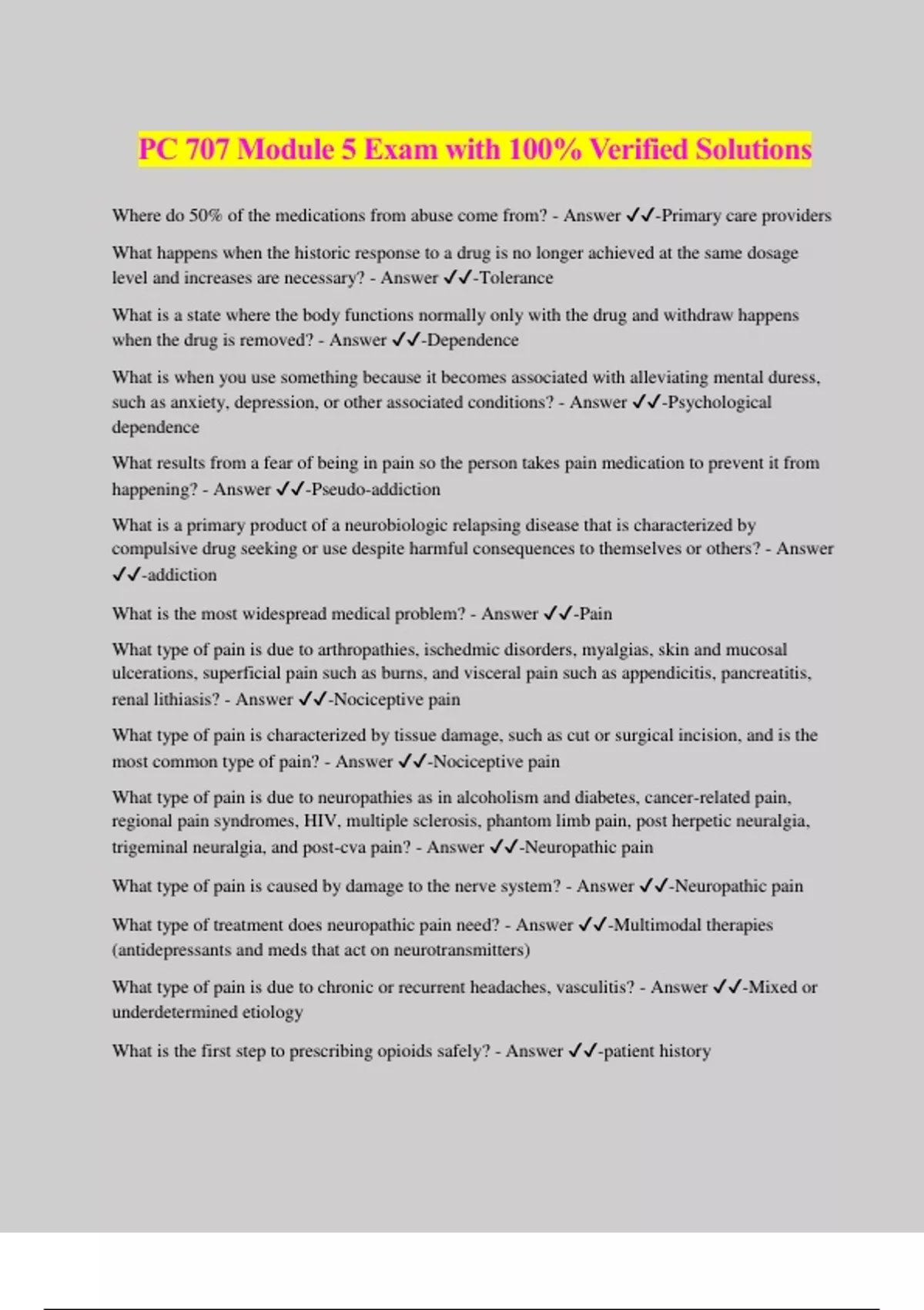 PC 707 Module 5 Exam with 100% Verified Solutions Where do 50% of the medications from abuse come from? - Answer ️️ -Primary care providers What happens when the historic response to a drug is no longer achieved at the same dosage level and increases are necessary? - Answer ️️ -Tolerance What is a state where the body functions normally only with the drug and withdraw happens when the drug is removed? - Answer ️️ -Dependence What is when you use something because it becomes associated with alleviating mental duress, such as anxiety, depression, or other associated conditions? - Answer ️️ -Psychological dependence What results from a fear of being in pain so the person takes pain medication to prevent it from happening? - Answer ️️ -Pseudo-addiction What is a primary product of a neurobiologic relapsing disease that is characterized by compulsive drug seeking or use despite harmful consequences to themselves or others? - Answer ️️ -addiction What is the most widespread medical problem? - Answer ️️ -Pain What type of pain is due to arthropathies, ischedmic disorders, myalgias, skin and mucosal ulcerations, superficial pain such as burns, and visceral pain such as appendicitis, pancreatitis, renal lithiasis? - Answer ️️ -Nociceptive pain What type of pain is characterized by tissue damage, such as cut or surgical incision, and is the most common type of pain? - Answer ️️ -Nociceptive pain What type of pain is due to neuropathies as in alcoholism and diabetes, cancer-related pain, regional pain syndromes, HIV, multiple sclerosis, phantom limb pain, post herpetic neuralgia, trigeminal neuralgia, and post-cva pain? - Answer ️️ -Neuropathic pain What type of pain is caused by damage to the nerve system? - Answer ️️ -Neuropathic pain What type of treatment does neuropathic pain need? - Answer ️️ -Multimodal therapies (antidepressants and meds that act on neurotransmitters) What type of pain is due to chronic or recurrent headaches, vasculitis? - Answer ️️ -Mixed or underdetermined etiology What is the first step to prescribing opioids safely? - Answer ️️ -patient history What histories are included on a patient who could potentially receive opioid treatment? - Answer ️️ -(1) social history (2) drug abuse history (3) depression screening (4) alcohol use (5) urine drug test (6) copy of other medical records (7) opioid drug use assessment What would you have a patient sign if they plan on using opioids? - Answer ️️ -Informed consent/patient-provider agreement If a person has a history of opioid usage/abuse, would that mean that you cannot prescribe them opioids for pain? - Answer ️️ -No If a person has a history of opioid usage/abuse, what would you do to help treat their pain? - Answer ️️ -Refer to pain management specialist What needs to be included in documentation for referral to pain management specialist? - Answer ️️ -Why the person is being referred What are the risks to prescribing opioids? - Answer ️️ -(1) respiratory depression (2) developing tolerance or dependence (3) overdose (4) drug interactions (5) risk of neonatal withdraw syndrome (6) inadvertent child use