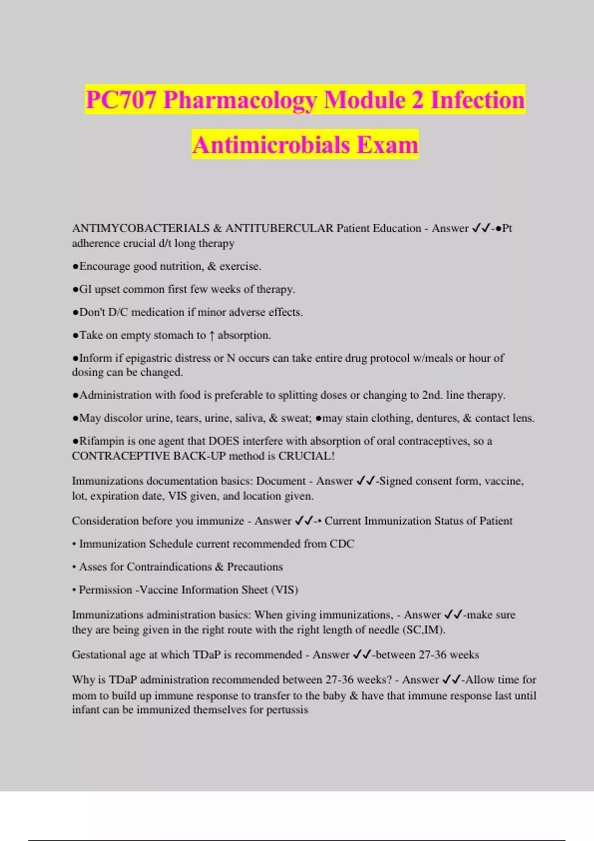 PC707 Pharmacology Module 2 Infection Antimicrobials Exam ANTIMYCOBACTERIALS & ANTITUBERCULAR Patient Education - Answer ️️ -●Pt adherence crucial d/t long therapy ●Encourage good nutrition, & exercise. ●GI upset common first few weeks of therapy. ●Don't D/C medication if minor adverse effects. ●Take on empty stomach to ↑ absorption. ●Inform if epigastric distress or N occurs can take entire drug protocol w/meals or hour of dosing can be changed. ●Administration with food is preferable to splitting doses or changing to 2nd. line therapy. ●May discolor urine, tears, urine, saliva, & sweat; ●may stain clothing, dentures, & contact lens. ●Rifampin is one agent that DOES interfere with absorption of oral contraceptives, so a CONTRACEPTIVE BACK-UP method is CRUCIAL! Immunizations documentation basics: Document - Answer ️️ -Signed consent form, vaccine, lot, expiration date, VIS given, and location given. Consideration before you immunize - Answer ️️ -• Current Immunization Status of Patient • Immunization Schedule current recommended from CDC • Asses for Contraindications & Precautions • Permission -Vaccine Information Sheet (VIS) Immunizations administration basics: When giving immunizations, - Answer ️️ -make sure they are being given in the right route with the right length of needle (SC,IM). Gestational age at which TDaP is recommended - Answer ️️ -between 27-36 weeks Why is TDaP administration recommended between 27-36 weeks? - Answer ️️ -Allow time for mom to build up immune response to transfer to the baby & have that immune response last until infant can be immunized themselves for pertussis TDap - Answer ️️ -Tetanus Diptheria acellular Pertussis DTaP - Answer ️️ -Diptheria, Tetanus, acellular Pertussis. Formulation used for people 2 months to 6 years old Populations for which pertussis can be lethal - Answer ️️ -newborns and elderly Situations when TDaP can & should be given at other times in pregnancy? - Answer ️️ -Injury with wound, pertussis outbreak, or other circumstance where it would be necessary. Primary reason TDaP is given during pregnancy & why we teach close contacts to also receive - Answer ️️ -to protect baby against Pertussis. Live vaccine - Answer ️️ -Live form, attenuated ; non-infective with low chance of causing disease; leads to long term immunity. (best and longest immune response) more likely to produce side effects Live vaccines contraindications: - Answer ️️ -Do NOT give live vaccines to: 1. pregnant women 2. immunocompormised people 3. Infants < 12 mos of age Killed Vaccine contraindications: - Answer ️️ -Encephalopathy, true allergy (egg > influenza) Reason Infants < 12 months should not get LIVE vaccines - Answer ️️ -they are not mature enough to build a strong immune response. Killed vaccine - Answer ️️ -Contains dead but antigenically active organism; might cause an immune response with symptoms but cannot cause the actual disease. Disadvantage of killed vaccine - Answer ️️ -Provide a shorter duration of protection & needs to be boosted more often. Example of Natural Active Immunity - Answer ️️ -contracting chicken pox & building your own antibodies to the varicell