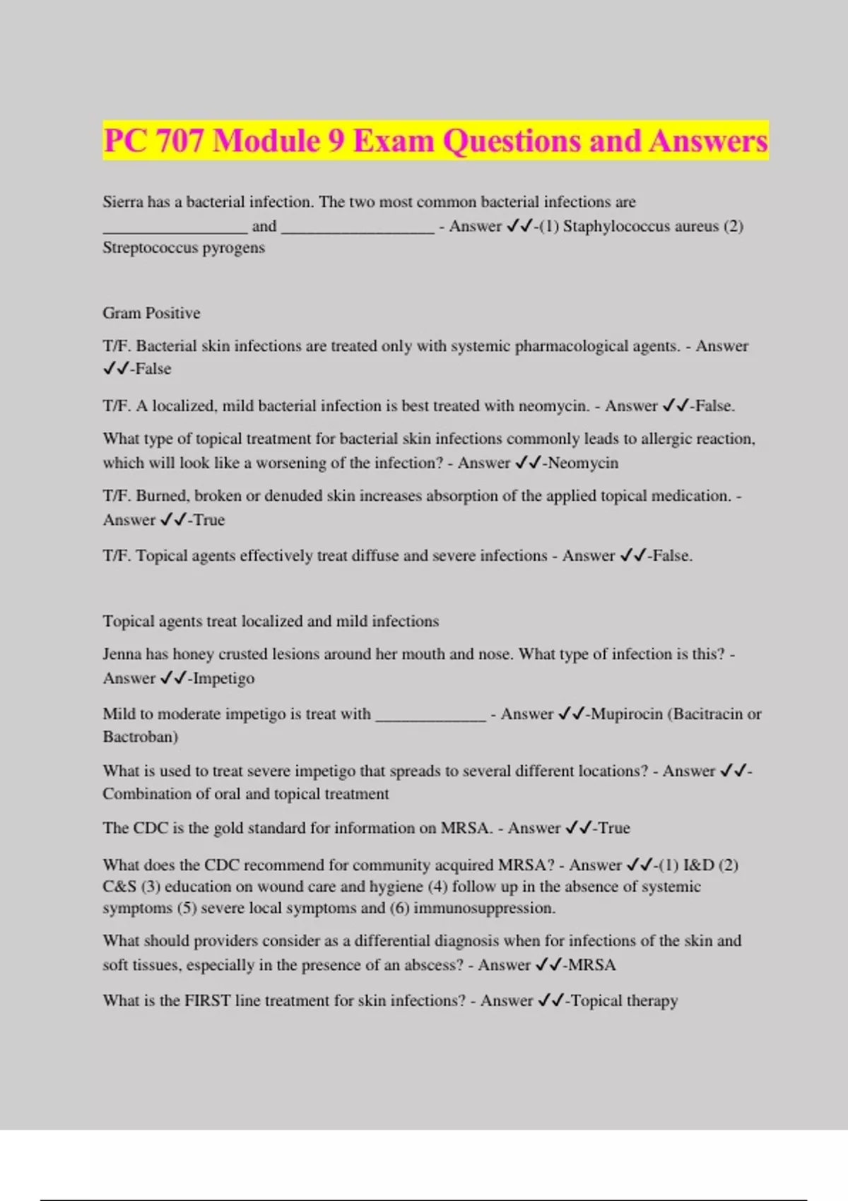PC 707 Module 9 Exam Questions and Answers Sierra has a bacterial infection. The two most common bacterial infections are _________________ and __________________ - Answer ️️ -(1) Staphylococcus aureus (2) Streptococcus pyrogens Gram Positive T/F. Bacterial skin infections are treated only with systemic pharmacological agents. - Answer ️️ -False T/F. A localized, mild bacterial infection is best treated with neomycin. - Answer ️️ -False. What type of topical treatment for bacterial skin infections commonly leads to allergic reaction, which will look like a worsening of the infection? - Answer ️️ -Neomycin T/F. Burned, broken or denuded skin increases absorption of the applied topical medication. - Answer ️️ -True T/F. Topical agents effectively treat diffuse and severe infections - Answer ️️ -False. Topical agents treat localized and mild infections Jenna has honey crusted lesions around her mouth and nose. What type of infection is this? - Answer ️️ -Impetigo Mild to moderate impetigo is treat with _____________ - Answer ️️ -Mupirocin (Bacitracin or Bactroban) What is used to treat severe impetigo that spreads to several different locations? - Answer ️️ - Combination of oral and topical treatment The CDC is the gold standard for information on MRSA. - Answer ️️ -True What does the CDC recommend for community acquired MRSA? - Answer ️️ -(1) I&D (2) C&S (3) education on wound care and hygiene (4) follow up in the absence of systemic symptoms (5) severe local symptoms and (6) immunosuppression. What should providers consider as a differential diagnosis when for infections of the skin and soft tissues, especially in the presence of an abscess? - Answer ️️ -MRSA What is the FIRST line treatment for skin infections? - Answer ️️ -Topical therapy Why are topical treatments first line therapy for skin infections - Answer ️️ -(1) Minimally absorbed (2) effective (3) few side effects (4) few interactions MOA of medications used to treat tinea? - Answer ️️ -Impair synthesis of ergosterol allowing increased permeability and leakage of cellular components resulting in cell death What are the most common fungi involved in primary care? - Answer ️️ -(1) Candida (2) Tinea What is the recommended route of administration for antifungal drugs? - Answer ️️ -Topical tinea capitis and tinea unguium are hard to treat so would you use topical therapy? - Answer ️️ -No. use systemic (oral) very hard to treat, resistant Sarah who is 32 weeks pregnant, has a fungal infection. The provider prescribes a topical anti- fungal. Are topical anti-fungals safe for use in pregnancy and lactation? - Answer ️️ -Yes How long would you treat a fungal infection? How long do you treat after lesions have disappeared? - Answer ️️ -2-4 weeks. 1 week Sarah who is 32 weeks pregnant has a fungal infection. The provider prescribes a systemic anti- fungal. What would you say? - Answer ️️ -Do no prescribe systemic anti-fungals for pregnant women Kisha has a yeast infection. What education would you provide Kisha? - Answer ️️ - Candidiasis loves dark, wet p
