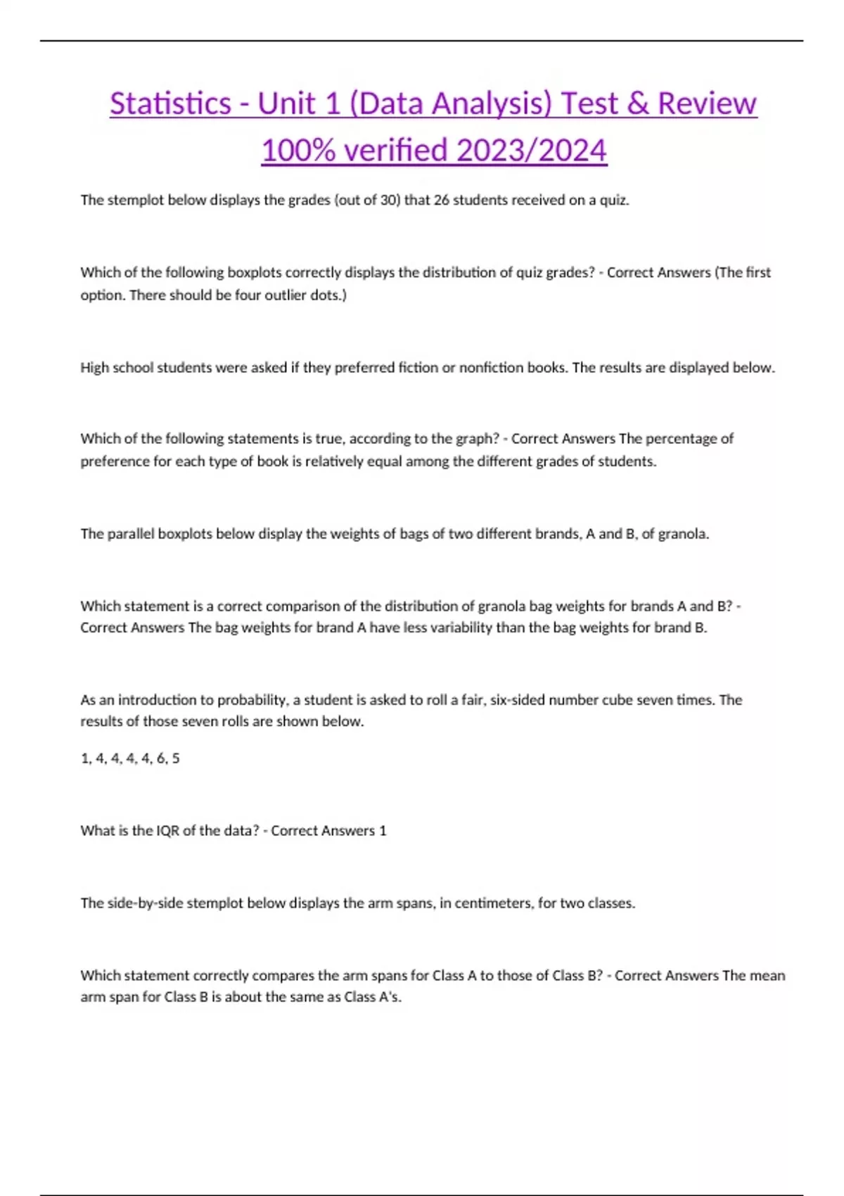 Statistics - Unit 1 (Data Analysis) Test & Review 100% verified 2023/2024