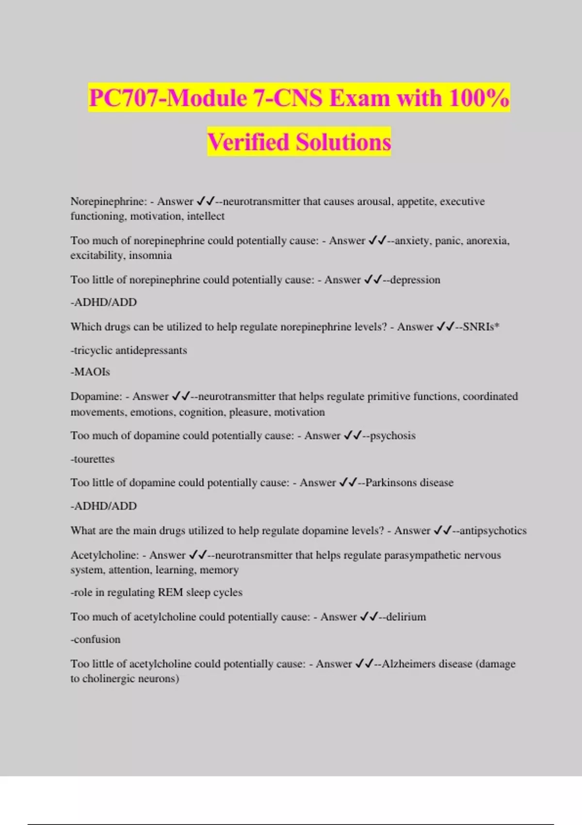 PC707-Module 7-CNS Exam with 100% Verified Solutions Norepinephrine: - Answer ️️ --neurotransmitter that causes arousal, appetite, executive functioning, motivation, intellect Too much of norepinephrine could potentially cause: - Answer ️️ --anxiety, panic, anorexia, excitability, insomnia Too little of norepinephrine could potentially cause: - Answer ️️ --depression -ADHD/ADD Which drugs can be utilized to help regulate norepinephrine levels? - Answer ️️ --SNRIs* -tricyclic antidepressants -MAOIs Dopamine: - Answer ️️ --neurotransmitter that helps regulate primitive functions, coordinated movements, emotions, cognition, pleasure, motivation Too much of dopamine could potentially cause: - Answer ️️ --psychosis -tourettes Too little of dopamine could potentially cause: - Answer ️️ --Parkinsons disease -ADHD/ADD What are the main drugs utilized to help regulate dopamine levels? - Answer ️️ --antipsychotics Acetylcholine: - Answer ️️ --neurotransmitter that helps regulate parasympathetic nervous system, attention, learning, memory -role in regulating REM sleep cycles Too much of acetylcholine could potentially cause: - Answer ️️ --delirium -confusion Too little of acetylcholine could potentially cause: - Answer ️️ --Alzheimers disease (damage to cholinergic neurons) What is the main drug utilized to help regulate acetylcholine levels? - Answer ️️ -- Acetylcholinesterase inhibitors (ACHEIs) Serotonin: - Answer ️️ --neurotransmitter that regulates sleep/wake cycles, mood/well-being, appetite, memory, learning, intestinal movements Too much of serotonin could potentially cause: - Answer ️️ --hallucinations -serotonin syndrome Too little of serotonin could potentially cause: - Answer ️️ --depression, anxiety, OCD, increased pain sensitivity What drugs could be utilized to help regulate serotonin levels? - Answer ️️ --SSRIs -SNRIs -Atypical antidepressants -Tricyclic antidepressants -MAOIs GABA: - Answer ️️ --neurotransmitter that inhibits transmissions from one nerve to another Too much GABA could potentially cause: - Answer ️️ --CNS depression, respiratory depression, sedation Too little GABA could potentially cause: - Answer ️️ --seizures Drugs utilized to help regulate GABA levels? - Answer ️️ --benzodiazepines -sedatives -hypnotic