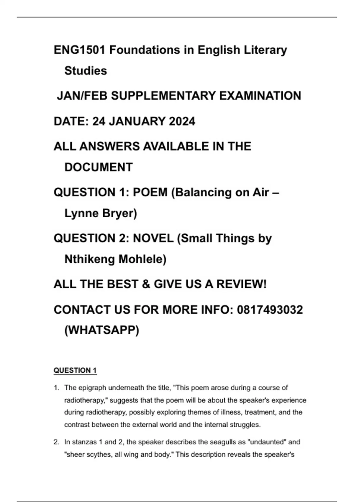 THIS DOCUMENT CONTAINS ALL ANSWERS FOR ENG1501 SUPPLEMENTARY EXAMINATION FOR JAN/FEB 2024. 90% PASS IS GUARANTEED. ALL ANSWERS ARE AVAILABLE ON THE SCRIPT. ALL THE BEST AND GIVE US A REVIEW!!