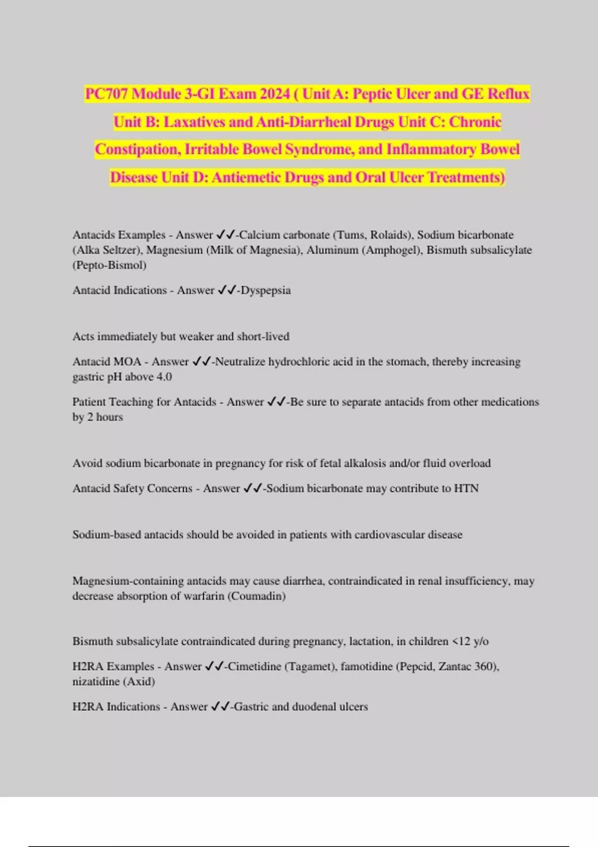PC707 Module 3-GI Exam 2024 ( Unit A: Peptic Ulcer and GE Reflux Unit B: Laxatives and Anti-Diarrheal Drugs Unit C: Chronic Constipation, Irritable Bowel Syndrome, and Inflammatory Bowel Disease Unit D: Antiemetic Drugs and Oral Ulcer Treatments)