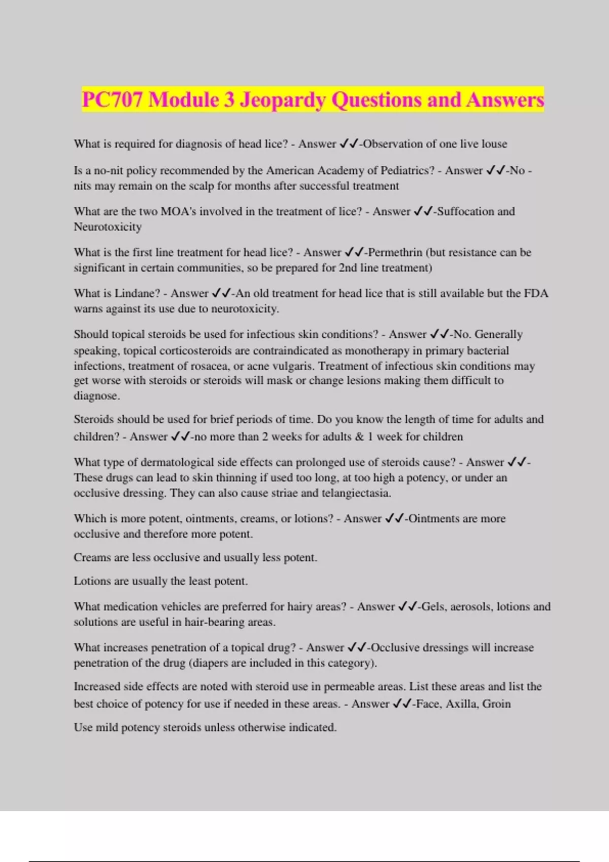 PC707 Module 3 Jeopardy Questions and Answers What is required for diagnosis of head lice? - Answer ️️ -Observation of one live louse Is a no-nit policy recommended by the American Academy of Pediatrics? - Answer ️️ -No - nits may remain on the scalp for months after successful treatment What are the two MOA's involved in the treatment of lice? - Answer ️️ -Suffocation and Neurotoxicity What is the first line treatment for head lice? - Answer ️️ -Permethrin (but resistance can be significant in certain communities, so be prepared for 2nd line treatment) What is Lindane? - Answer ️️ -An old treatment for head lice that is still available but the FDA warns against its use due to neurotoxicity. Should topical steroids be used for infectious skin conditions? - Answer ️️ -No. Generally speaking, topical corticosteroids are contraindicated as monotherapy in primary bacterial infections, treatment of rosacea, or acne vulgaris. Treatment of infectious skin conditions may get worse with steroids or steroids will mask or change lesions making them difficult to diagnose. Steroids should be used for brief periods of time. Do you know the length of time for adults and children? - Answer ️️ -no more than 2 weeks for adults & 1 week for children What type of dermatological side effects can prolonged use of steroids cause? - Answer ️️ - These drugs can lead to skin thinning if used too long, at too high a potency, or under an occlusive dressing. They can also cause striae and telangiectasia. Which is more potent, ointments, creams, or lotions? - Answer ️️ -Ointments are more occlusive and therefore more potent. Creams are less occlusive and usually less potent. Lotions are usually the least potent. What medication vehicles are preferred for hairy areas? - Answer ️️ -Gels, aerosols, lotions and solutions are useful in hair-bearing areas. What increases penetration of a topical drug? - Answer ️️ -Occlusive dressings will increase penetration of the drug (diapers are included in this category). Increased side effects are noted with steroid use in permeable areas. List these areas and list the best choice of potency for use if needed in these areas. - Answer ️️ -Face, Axilla, Groin Use mild potency steroids unless otherwise indicated.