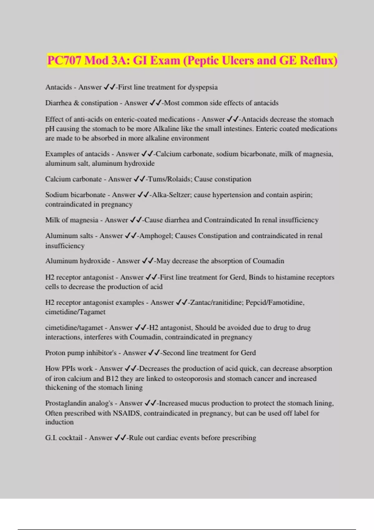 PC707 Mod 3A: GI Exam (Peptic Ulcers and GE Reflux) Antacids - Answer ️️ -First line treatment for dyspepsia Diarrhea & constipation - Answer ️️ -Most common side effects of antacids Effect of anti-acids on enteric-coated medications - Answer ️️ -Antacids decrease the stomach pH causing the stomach to be more Alkaline like the small intestines. Enteric coated medications are made to be absorbed in more alkaline environment Examples of antacids - Answer ️️ -Calcium carbonate, sodium bicarbonate, milk of magnesia, aluminum salt, aluminum hydroxide Calcium carbonate - Answer ️️ -Tums/Rolaids; Cause constipation Sodium bicarbonate - Answer ️️ -Alka-Seltzer; cause hypertension and contain aspirin; contraindicated in pregnancy Milk of magnesia - Answer ️️ -Cause diarrhea and Contraindicated In renal insufficiency Aluminum salts - Answer ️️ -Amphogel; Causes Constipation and contraindicated in renal insufficiency Aluminum hydroxide - Answer ️️ -May decrease the absorption of Coumadin H2 receptor antagonist - Answer ️️ -First line treatment for Gerd, Binds to histamine receptors cells to decrease the production of acid H2 receptor antagonist examples - Answer ️️ -Zantac/ranitidine; Pepcid/Famotidine, cimetidine/Tagamet cimetidine/tagamet - Answer ️️ -H2 antagonist, Should be avoided due to drug to drug interactions, interferes with Coumadin, contraindicated in pregnancy