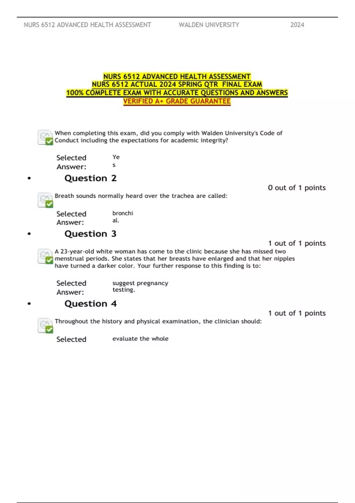 NURS 6512 ADVANCED HEALTH ASSESSMENT NURS 6512 ACTUAL 2024 SPRING QTR FINAL EXAM 100% COMPLETE EXAM WITH ACCURATE QUESTIONS AND ANSWERS VERIFIED A+ GRADE GUARANTEE When completing this exam, did you comply with Walden University's Code of Conduct including the expectations for academic integrity? Selected Ye Answer: s • Question 2 Breath sounds normally heard over the trachea are called: 0 out of 1 points Selected Answer: bronchi al. • Question 3 1 out of 1 points A 23-year-old white woman has come to the clinic because she has missed two menstrual periods. She states that her breasts have enlarged and that her nipples have turned a darker color. Your further response to this finding is to: Selected Answer: suggest pregnancy testing. • Question 4 Throughout the history and physical examination, the clinician should: Selected evaluate the whole 1 out of 1 points Answer: patient. • Question 5 1 out of 1 points You are examining a patient in the emergency department who has recently sustained head trauma. In order to initially assess this patient's neurologic status, you would: Selected Answer: test the six cardinal points of gaze. • Question 6 When palpating joints, crepitus may occur when: 1 out of 1 points Selected Answer: irregular bony surfaces rub together. • Question 7 1 out of 1 points You are conducting an examination of Mr. Curtis's heart and blood vessels and auscultate a grade III murmur. The intensity of this murmur is: Selected Answer: moderately loud. • Question 8 1 out of 1 points Which cranial nerves are usually evaluated during the examination of the eyes? Selected Answer: III and VI • Question 9 1 out of 1 points Inquiry about nocturnal muscle spasms would be most significant when taking the musculoskeletal history of: Selected Answer: older adults. • Question 10 Ulnar deviation and boutonniere deformities are characteristic of: 1 out of 1 points Selected Answer: rheumatoid arthritis. • Question 11 Inspection of the scrotum should reveal: 1 out of 1 points Selected Answer: left scrotal sac lower than the right. • Question 12 The adnexa of the uterus are composed of the: 1 out of 1 points Selected Answer: fallopian tubes and ovaries. • Question 13 Montgomery tubercles are most prominent in the breasts of: 1 out of 1 points Selected Answer: pregnant women. • Question 14 1 out of 1 points In the adult, the apical impulse should be most visible when the patient is in what position? Selected Answer: Uprig ht • Question 15 1 out of 1 points You are inspecting the genitalia of an uncircumcised adult male. The foreskin is tight and cannot be easily retracted. You should: