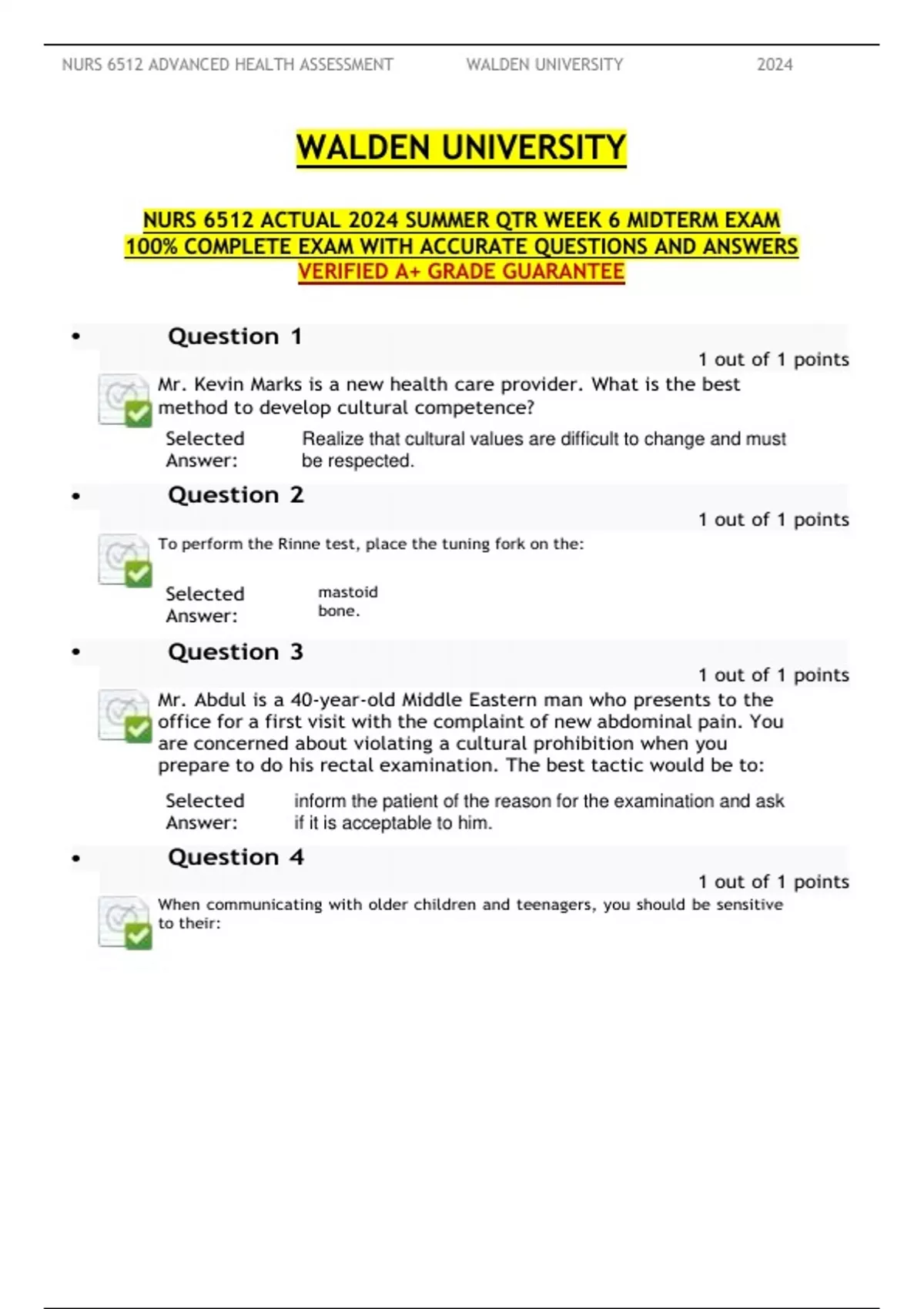 WALDEN UNIVERSITY NURS 6512 ACTUAL 2024 SUMMER QTR WEEK 6 MIDTERM EXAM 100% COMPLETE EXAM WITH ACCURATE QUESTIONS AND ANSWERS VERIFIED A+ GRADE GUARANTEE