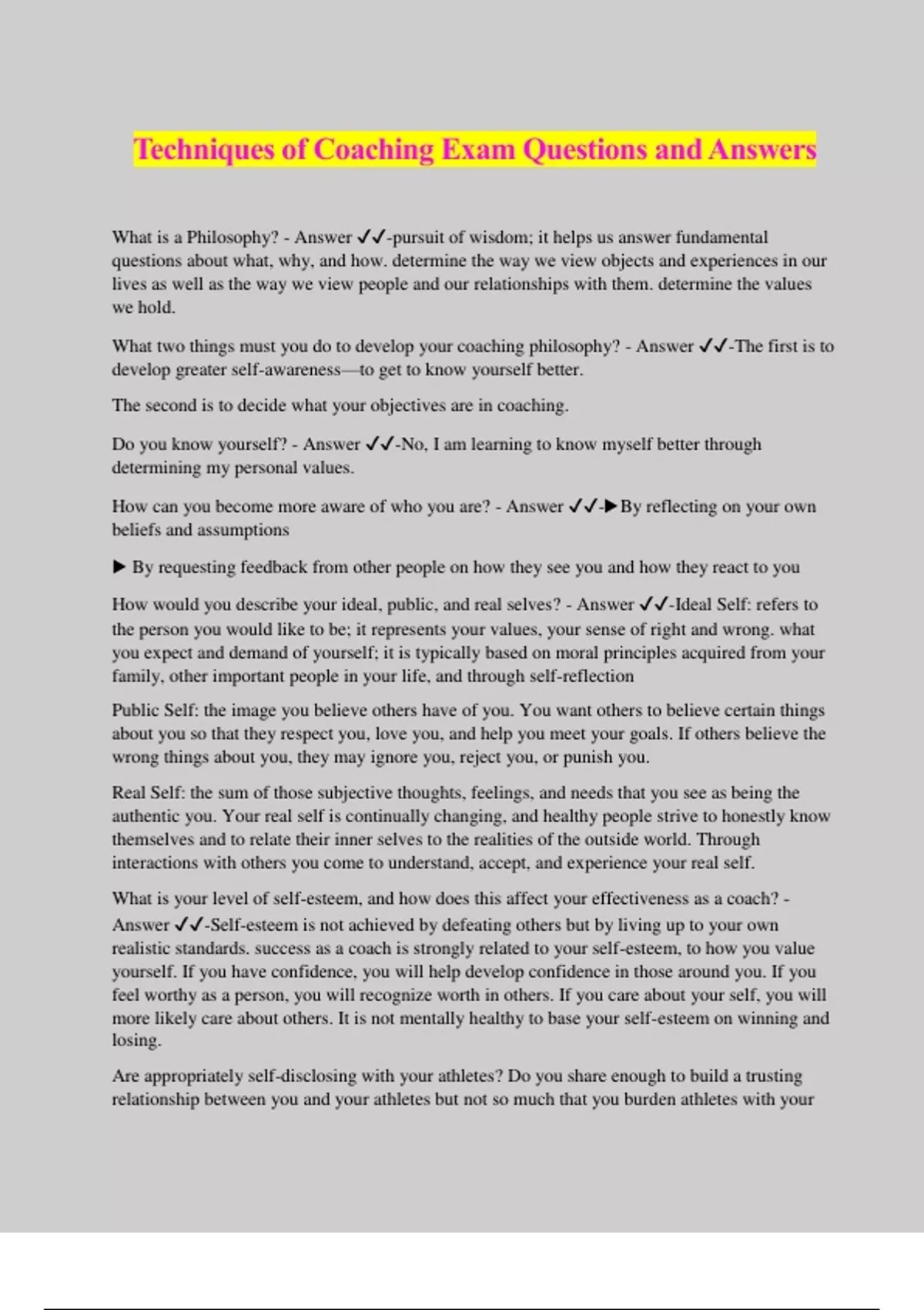 Techniques of Coaching Exam Questions and Answers What is a Philosophy? - Answer ️️ -pursuit of wisdom; it helps us answer fundamental questions about what, why, and how. determine the way we view objects and experiences in our lives as well as the way we view people and our relationships with them. determine the values we hold. What two things must you do to develop your coaching philosophy? - Answer ️️ -The first is to develop greater self-awareness—to get to know yourself better. The second is to decide what your objectives are in coaching. Do you know yourself? - Answer ️️ -No, I am learning to know myself better through determining my personal values. How can you become more aware of who you are? - Answer ️️ -▶By reflecting on your own beliefs and assumptions ▶ By requesting feedback from other people on how they see you and how they react to you How would you describe your ideal, public, and real selves? - Answer ️️ -Ideal Self: refers to the person you would like to be; it represents your values, your sense of right and wrong. what you expect and demand of yourself; it is typically based on moral principles acquired from your family, other important people in your life, and through self-reflection Public Self: the image you believe others have of you. You want others to believe certain things about you so that they respect you, love you, and help you meet your goals. If others believe the wrong things about you, they may ignore you, reject you, or punish you. Real Self: the sum of those subjective thoughts, feelings, and needs that you see as being the authentic you. Your real self is continually changing, and healthy people strive to honestly know themselves and to relate their inner selves to the realities of the outside world. Through interactions with others you come to understand, accept, and experience your real self. What is your level of self-esteem, and how does this affect your effectiveness as a coach? - Answer ️️ -Self-esteem is not achieved by defeating others but by living up to your own realistic standards. success as a coach is strongly related to your self-esteem, to how you value yourself. If you have confidence, you will help develop confidence in those around you. If you feel worthy as a person, you will recognize worth in others. If you care about your self, you will more likely care about others. It is not mentally healthy to base your self-esteem on winning and losing. Are appropriately self-disclosing with your athletes? Do you share enough to build a trusting relationship between you and your athletes but not so much that you burden athletes with your