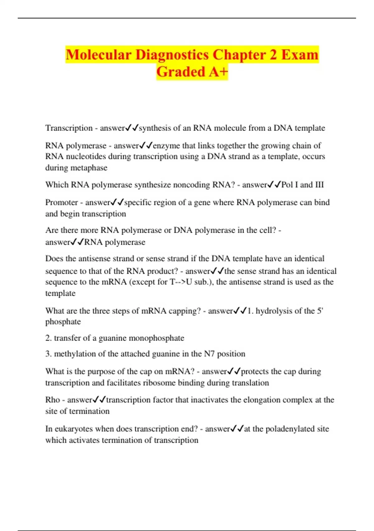 Molecular Diagnostics Chapter 2 Exam Graded A+ Transcription - answersynthesis of an RNA molecule from a DNA template RNA polymerase - answerenzyme that links together the growing chain of RNA nucleotides during transcription using a DNA strand as a template, occurs during metaphase Which RNA polymerase synthesize noncoding RNA? - answerPol I and III Promoter - answerspecific region of a gene where RNA polymerase can bind and begin transcription Are there more RNA polymerase or DNA polymerase in the cell? - answerRNA polymerase Does the antisense strand or sense strand if the DNA template have an identical sequence to that of the RNA product? - answerthe sense strand has an identical sequence to the mRNA (except for T-->U sub.), the antisense strand is used as the template What are the three steps of mRNA capping? - answer1. hydrolysis of the 5' phosphate 2. transfer of a guanine monophosphate 3. methylation of the attached guanine in the N7 position What is the purpose of the cap on mRNA? - answerprotects the cap during transcription and facilitates ribosome binding during translation Rho - answertranscription factor that inactivates the elongation complex at the site of termination In eukaryotes when does transcription end? - answerat the poladenylated site which activates termination of transcription