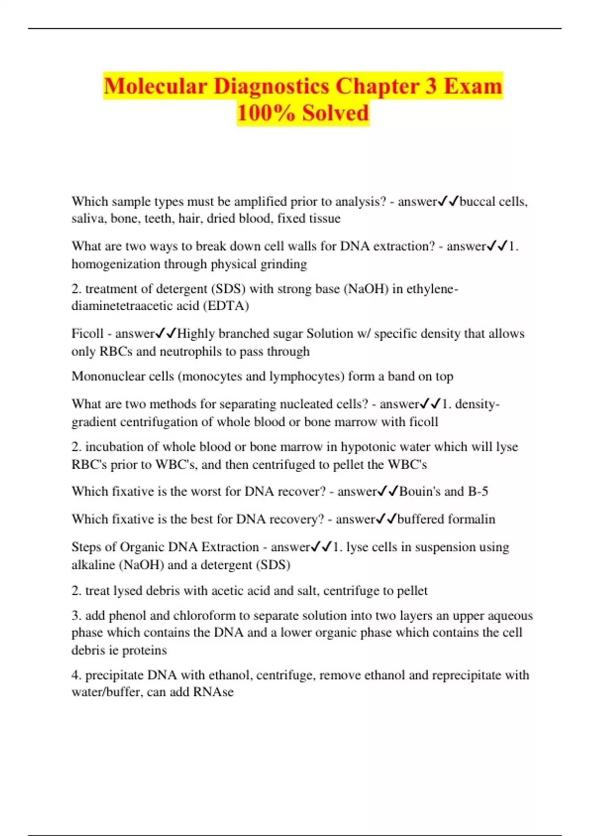Molecular Diagnostics Chapter 3 Exam 100% Solved Which sample types must be amplified prior to analysis? - answerbuccal cells, saliva, bone, teeth, hair, dried blood, fixed tissue What are two ways to break down cell walls for DNA extraction? - answer1. homogenization through physical grinding 2. treatment of detergent (SDS) with strong base (NaOH) in ethylene- diaminetetraacetic acid (EDTA) Ficoll - answerHighly branched sugar Solution w/ specific density that allows only RBCs and neutrophils to pass through Mononuclear cells (monocytes and lymphocytes) form a band on top What are two methods for separating nucleated cells? - answer1. density- gradient centrifugation of whole blood or bone marrow with ficoll 2. incubation of whole blood or bone marrow in hypotonic water which will lyse RBC's prior to WBC's, and then centrifuged to pellet the WBC's Which fixative is the worst for DNA recover? - answerBouin's and B-5 Which fixative is the best for DNA recovery? - answerbuffered formalin Steps of Organic DNA Extraction - answer1. lyse cells in suspension using alkaline (NaOH) and a detergent (SDS) 2. treat lysed debris with acetic acid and salt, centrifuge to pellet 3. add phenol and chloroform to separate solution into two layers an upper aqueous phase which contains the DNA and a lower organic phase which contains the cell debris ie proteins 4. precipitate DNA with ethanol, centrifuge, remove ethanol and reprecipitate with water/buffer, can add RNAs