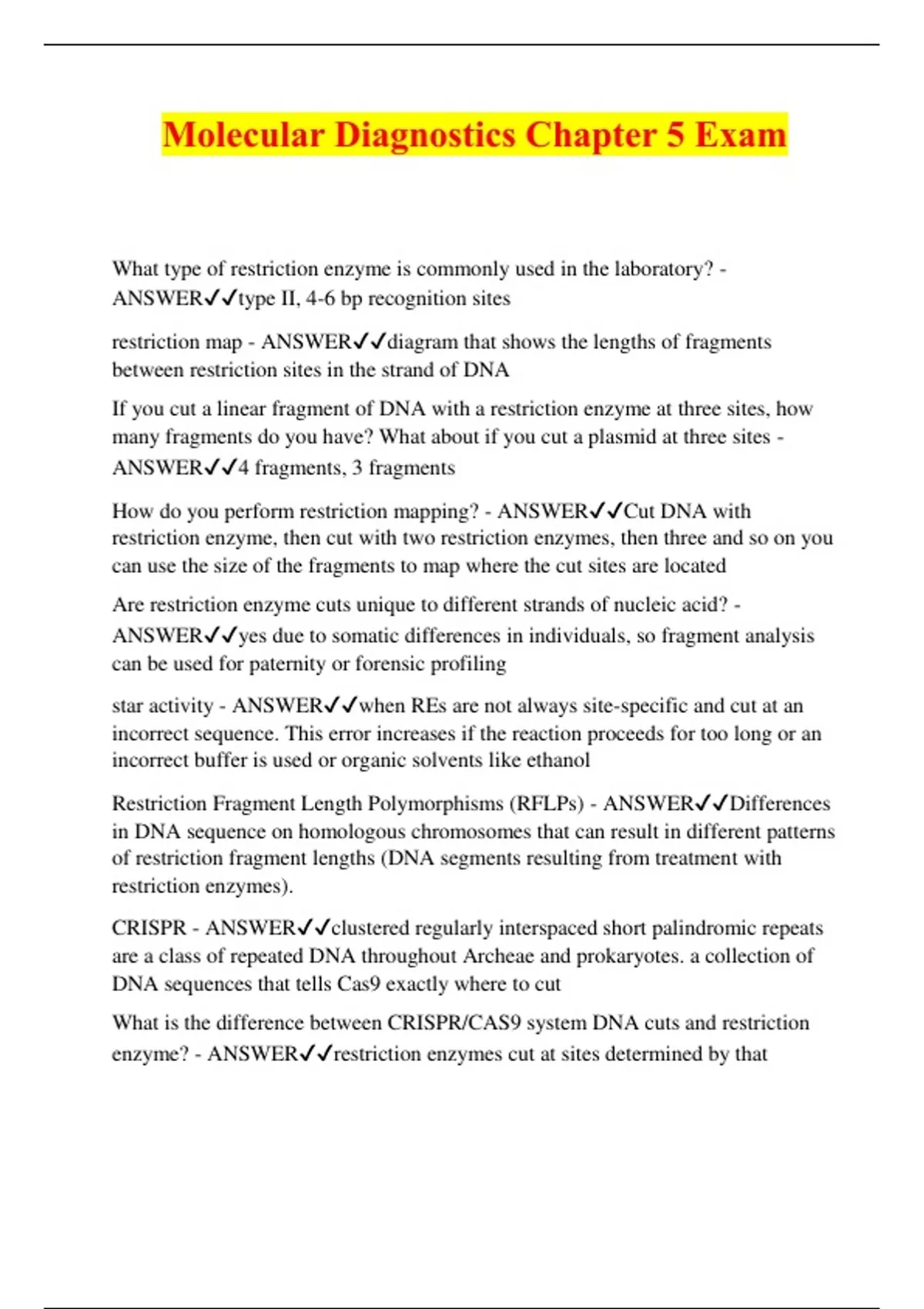 Molecular Diagnostics Chapter 5 Exam What type of restriction enzyme is commonly used in the laboratory? - ANSWERtype II, 4-6 bp recognition sites restriction map - ANSWERdiagram that shows the lengths of fragments between restriction sites in the strand of DNA If you cut a linear fragment of DNA with a restriction enzyme at three sites, how many fragments do you have? What about if you cut a plasmid at three sites - ANSWER4 fragments, 3 fragments How do you perform restriction mapping? - ANSWERCut DNA with restriction enzyme, then cut with two restriction enzymes, then three and so on you can use the size of the fragments to map where the cut sites are located Are restriction enzyme cuts unique to different strands of nucleic acid? - ANSWERyes due to somatic differences in individuals, so fragment analysis can be used for paternity or forensic profiling star activity - ANSWERwhen REs are not always site-specific and cut at an incorrect sequence. This error increases if the reaction proceeds for too long or an incorrect buffer is used or organic solvents like ethanol Restriction Fragment Length Polymorphisms (RFLPs) - ANSWERDifferences in DNA sequence on homologous chromosomes that can result in different patterns of restriction fragment lengths (DNA segments resulting from treatment with restriction enzymes). CRISPR - ANSWERclustered regularly interspaced short palindromic repeats are a class of repeated DNA throughout Archeae and prokaryotes. a collection of DNA sequences that tells Cas9 exactly where to cut What is the difference between CRISPR/CAS9 system DNA cuts and restriction enzyme? - ANSWERrestriction enzymes cut at sites determined by that