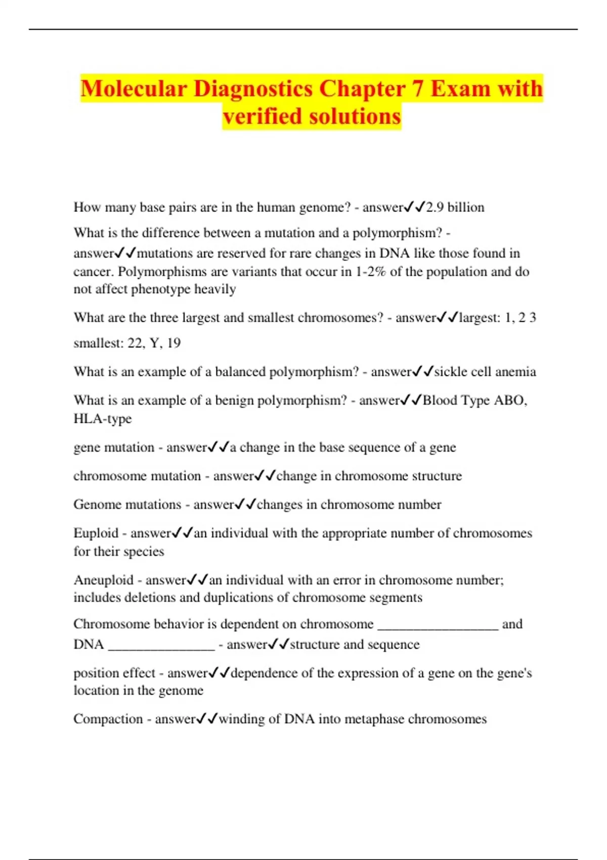 Molecular Diagnostics Chapter 7 Exam with verified solutions How many base pairs are in the human genome? - answer2.9 billion What is the difference between a mutation and a polymorphism? - answermutations are reserved for rare changes in DNA like those found in cancer. Polymorphisms are variants that occur in 1-2% of the population and do not affect phenotype heavily What are the three largest and smallest chromosomes? - answerlargest: 1, 2 3 smallest: 22, Y, 19 What is an example of a balanced polymorphism? - answersickle cell anemia What is an example of a benign polymorphism? - answerBlood Type ABO, HLA-type gene mutation - answera change in the base sequence of a gene chromosome mutation - answerchange in chromosome structure Genome mutations - answerchanges in chromosome number Euploid - answeran individual with the appropriate number of chromosomes for their species Aneuploid - answeran individual with an error in chromosome number; includes deletions and duplications of chromosome segments Chromosome behavior is dependent on chromosome _________________ and DNA _______________ - answerstructure and sequence position effect - answerdependence of the expression of a gene on the gene's location in the genome Compaction - answerwinding of DNA into metaphase chromosomes