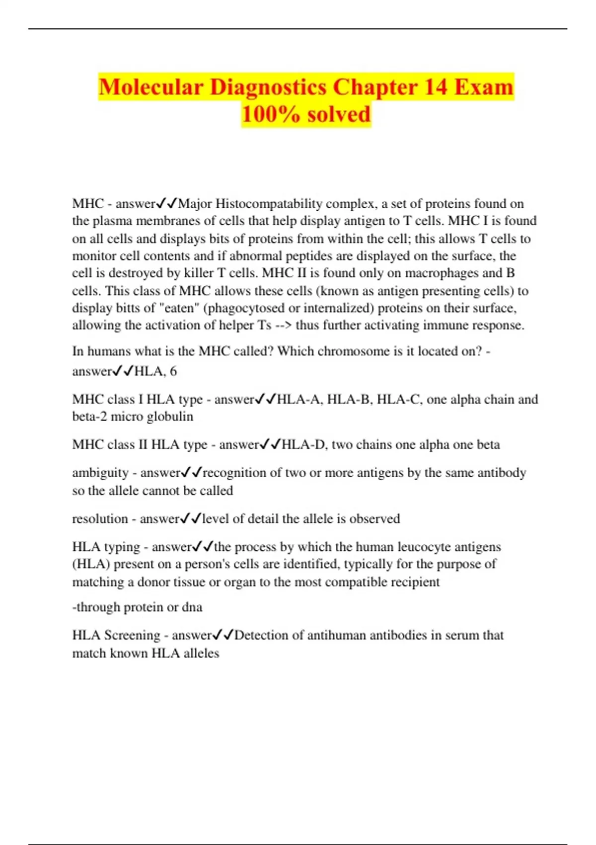Molecular Diagnostics Chapter 14 Exam 100% solved MHC - answerMajor Histocompatability complex, a set of proteins found on the plasma membranes of cells that help display antigen to T cells. MHC I is found on all cells and displays bits of proteins from within the cell; this allows T cells to monitor cell contents and if abnormal peptides are displayed on the surface, the cell is destroyed by killer T cells. MHC II is found only on macrophages and B cells. This class of MHC allows these cells (known as antigen presenting cells) to display bitts of "eaten" (phagocytosed or internalized) proteins on their surface, allowing the activation of helper Ts --> thus further activating immune response. In humans what is the MHC called? Which chromosome is it located on? - answerHLA, 6 MHC class I HLA type - answerHLA-A, HLA-B, HLA-C, one alpha chain and beta-2 micro globulin MHC class II HLA type - answerHLA-D, two chains one alpha one beta ambiguity - answerrecognition of two or more antigens by the same antibody so the allele cannot be called resolution - answerlevel of detail the allele is observed