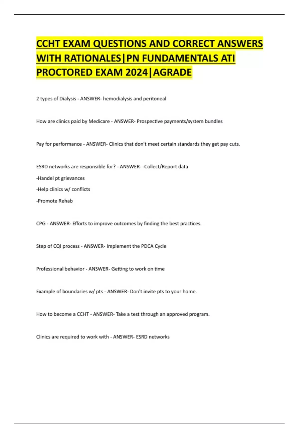 CCHT EXAM QUESTIONS AND CORRECT ANSWERS WITH RATIONALES|PN FUNDAMENTALS ATI PROCTORED EXAM 2024|AGRADE 2 types of Dialysis - ANSWER- hemodialysis and peritoneal How are clinics paid by Medicare - ANSWER- Prospective payments/system bundles Pay for performance - ANSWER- Clinics that don't meet certain standards they get pay cuts. ESRD networks are responsible for? - ANSWER- -Collect/Report data -Handel pt grievances -Help clinics w/ conflicts -Promote Rehab CPG - ANSWER- Efforts to improve outcomes by finding the best practices. Step of CQI process - ANSWER- Implement the PDCA Cycle Professional behavior - ANSWER- Getting to work on time Example of boundaries w/ pts - ANSWER- Don't invite pts to your home. How to become a CCHT - ANSWER- Take a test through an approved program. Clinics are required to work with - ANSWER- ESRD networks ESRD - ANSWER- End Stage Renal Disease CQI - ANSWER- Continuous Quality Improvement Nephron made up of - ANSWER- Glomerous & Tubule Most common cause of AKF in USA - ANSWER- Diabetes AKF - ANSWER- Acute Kidney Faliure Build up of wastes in blood caused by AKF? - ANSWER- Uremia Cause of secondary Hyperthyroidism w/ AKF - ANSWER- Kidneys no longer make Vit. D What are some electrolytes - ANSWER- Ca & Na Ca - ANSWER- Calcium Na - ANSWER- Sodium > K - ANSWER- Hyperkalemia Dry wt - ANSWER- wt post to when all/most of excess H20 is gone/removed. Pt wants to leave 20min early? (Your response) - ANSWER- You need every min of tx to avoid complications. pt asks a Q you don't know the answer to. - ANSWER- Refer pt to staff member that can Team member that helps ppl cope w/ AKF? - ANSWER- SW Solution - ANSWER- Solvent & Solute Semipermeable membrane - ANSWER- A filter that allows certain sized particles to pass through. Diffusion - ANSWER- Solutes move through a membrane from higher concentration to a lower one. Fastest method of diffusion - ANSWER- Small particles, warm solution, Large pores Osmosis - ANSWER- H20 moves through a membrane from a lower to higher solute. UF role in Dialysis - ANSWER- Removes H20 from blood UF - ANSWER- Ultrafiltration Intravascular fluid compartment - ANSWER- Blood inside blood vessels In Dialysis waste in the blood? - ANSWER- Decreases