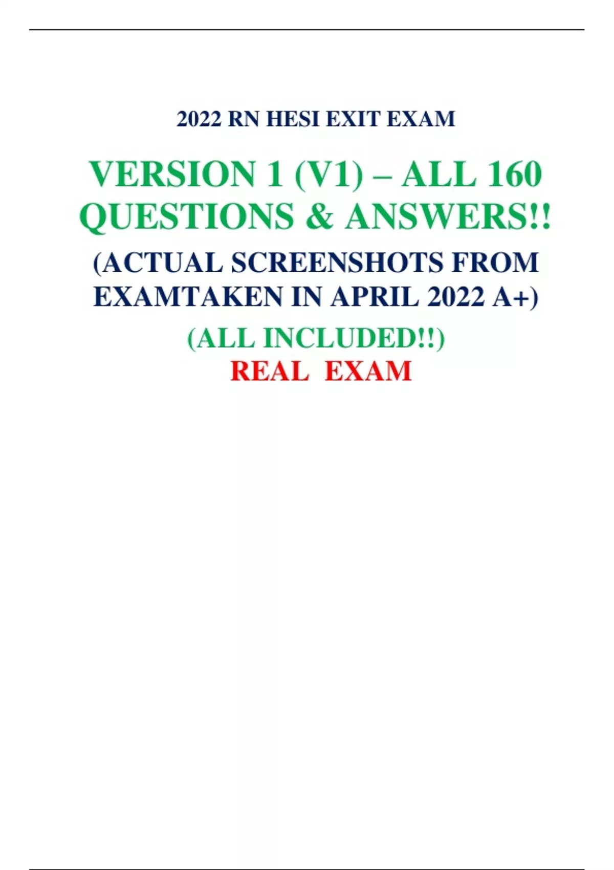 2022 RN HESI EXIT EXAM VERSION 1 (V1) – ALL 160 QUESTIONS & ANSWERS!! (ACTUAL SCREENSHOTS FROM EXAMTAKEN IN APRIL 2022 A+) (ALL INCLUDED!!) REAL EXAM