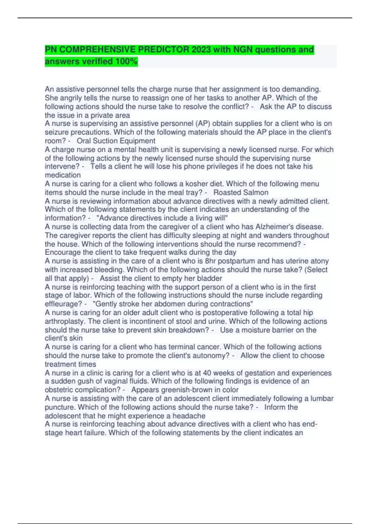 PN COMPREHENSIVE PREDICTOR 2023 with NGN questions and answers verified 100% An assistive personnel tells the charge nurse that her assignment is too demanding. She angrily tells the nurse to reassign one of her tasks to another AP. Which of the following actions should the nurse take to resolve the conflict? - Ask the AP to discuss the issue in a private area A nurse is supervising an assistive personnel (AP) obtain supplies for a client who is on seizure precautions. Which of the following materials should the AP place in the client's room? - Oral Suction Equipment A charge nurse on a mental health unit is supervising a newly licensed nurse. For which of the following actions by the newly licensed nurse should the supervising nurse intervene? - Tells a client he will lose his phone privileges if he does not take his medication A nurse is caring for a client who follows a kosher diet. Which of the following menu items should the nurse include in the meal tray? - Roasted Salmon A nurse is reviewing information about advance directives with a newly admitted client. Which of the following statements by the client indicates an understanding of the information? - "Advance directives include a living will" A nurse is collecting data from the caregiver of a client who has Alzheimer's disease. The caregiver reports the client has difficulty sleeping at night and wanders throughout the house. Which of the following interventions should the nurse recommend? - Encourage the client to take frequent walks during the day A nurse is assisting in the care of a client who is 8hr postpartum and has uterine atony with increased bleeding. Which of the following actions should the nurse take? (Select all that apply) - Assist the client to empty her bladder A nurse is reinforcing teaching with the support person of a client who is in the first stage of labor. Which of the following instructions should the nurse include regarding effleurage? - "Gently stroke her abdomen during contractions" A nurse is caring for an older adult client who is postoperative following a total hip arthroplasty. The client is incontinent of stool and urine. Which of the following actions should the nurse take to prevent skin breakdown? - Use a moisture barrier on the client's skin A nurse is caring for a client who has terminal cancer. Which of the following actions should the nurse take to promote the client's autonomy? - Allow the client to choose treatment times A nurse in a clinic is caring for a client who is at 40 weeks of gestation and experiences a sudden gush of vaginal fluids. Which of the following findings is evidence of an obstetric complication? - Appears greenish-brown in color A nurse is assisting with the care of an adolescent client immediately following a lumbar puncture. Which of the following actions should the nurse take? - Inform the adolescent that he might experience a headache A nurse is reinforcing teaching about advance directives with a client who has endstage heart failure. Which of the following statements by the client indicates an understanding of the teaching? - "I should discuss this document with my family after I sign it" A nurse is caring for a client who has continuous bladder irrigation following a transurethral resection of the prostate. The nurse notices clots and dark red blood in the catheter collection bag. Which of the following actions should the nurse take? - Irrigate the bladder with 20 to 30 mL of 0.9% sodium chloride A nurse is planning to obtain a 12-lead ECG for a client who has a history of cardiac dysrhythmias. Which of the following actions should the nurse plan to take? - Instruct the client to remain as still as possible during the recording A nurse is reinforcing teaching with a client who has genital herpes. Which of the following information should the nurse include in the teaching? - "You should increase fluid intake to relieve dysuria" A nurse is preparing to empty a postoperative client's closed-wound drainage system. Which of the following actions should the nurse plan to take? - Compress the container before replacing the drainage plug A nurse is reinforcing teaching with the parents of a toddler who has a new diagnosis of asthma and a prescription for montelukast. Which of the following instructions should the nurse include in the teaching? - Administer the medication to the toddler each evening A nurse in an acute mental health facility is caring for a newly admitted client. Which of the following should occur during the orientation phase of the nurse-client relationship? - Defining responsibilities A nurse is caring for a client who reports having a decrease in fetal movement following an external cephalic version 6 hr ago. The nurse identifies the fetus is in the right occiput anterior position. The nurse should place the fetal heart monitor on which of the following sites to auscultate the fetal heart rate? - Lower left A charge nurse is observing a newly licensed nurse perform suctioning for a client who has a tracheostomy. For which of the following actions by the newly licensed nurse should the charge nurse intervene? - Suction for 30 seconds A nurse is reviewing the medication administration record of a client who takes atenolol PO and supplies a nitroglycerin transdermal patch daily. Which of the following interactions should the nurse monitor with this client? - Hypotension A nurse in an acute care setting is preparing to administer medications to a client. Which of the following actions should the nurse verify the client's identity? - Verify the client's identity using a photograph A nurse in a provider's office is collecting data from a client who has psoriasis. Which of the following statements made by the client should she report to the provider? - "I try not to look at the scales on my body" A nurse is completing chart reviews in a long-term care facility in response to an increase in falls. Which of the following responses in the chart should the nur