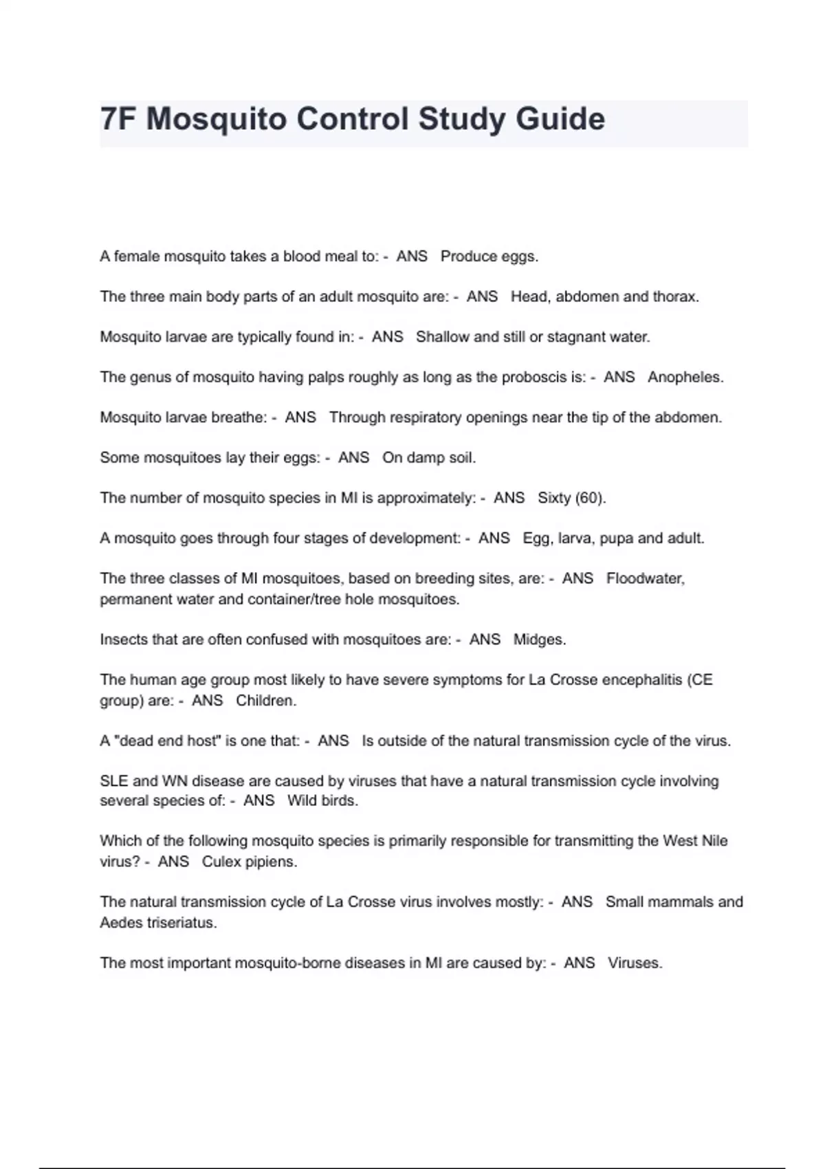 7F Mosquito Control Study Guide Exam Questions And Answers A female mosquito takes a blood meal to: - ANS Produce eggs. The three main body parts of an adult mosquito are: - ANS Head, abdomen and thorax. Mosquito larvae are typically found in: - ANS Shallow and still or stagnant water. The genus of mosquito having palps roughly as long as the proboscis is: - ANS Anopheles. Mosquito larvae breathe: - ANS Through respiratory openings near the tip of the abdomen. Some mosquitoes lay their eggs: - ANS On damp soil. The number of mosquito species in MI is approximately: - ANS Sixty (60). A mosquito goes through four stages of development: - ANS Egg, larva, pupa and adult. The three classes of MI mosquitoes, based on breeding sites, are: - ANS Floodwater, permanent water and container/tree hole mosquitoes. Insects that are often confused with mosquitoes are: - ANS Midges. The human age group most likely to have severe symptoms for La Crosse encephalitis (CE group) are: - ANS Children. A "dead end host" is one that: - ANS Is outside of the natural transmission cycle of the virus. SLE and WN disease are caused by viruses that have a natural transmission cycle involving several species of: - ANS Wild birds. Which of the following mosquito species is primarily responsible for transmitting the West Nile virus? - ANS Culex pipiens. The natural transmission cycle of La Crosse virus involves mostly: - ANS Small mammals and Aedes triseriatus. The most important mosquito-borne diseases in MI are caused by: - ANS Viruses. Heartworm infection in dogs in MI is vectored by: - ANS More than 25% of the mosquito species in MI.