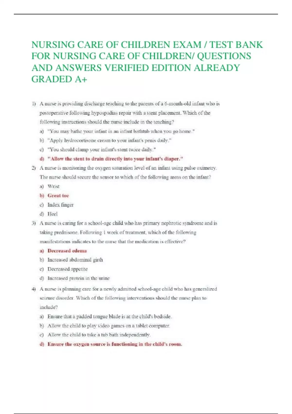 NURSING CARE OF CHILDREN EXAM / TEST BANK FOR NURSING CARE OF CHILDREN/ QUESTIONS AND ANSWERS VERIFIED EDITION ALREADY GRADED A+
