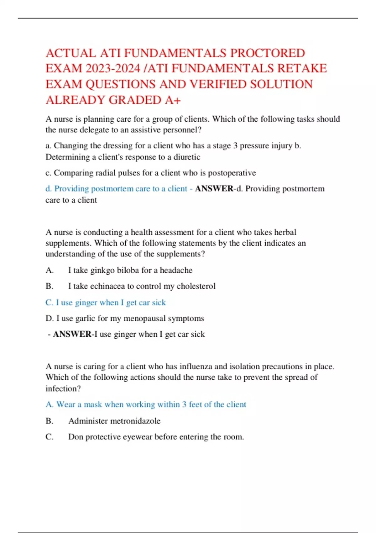 ATI FUNDAMENTALS PROCTORED EXAM /ATI FUNDAMENTALS RETAKE EXAM QUESTIONS AND VERIFIED SOLUTION ALREADY GRADED A+