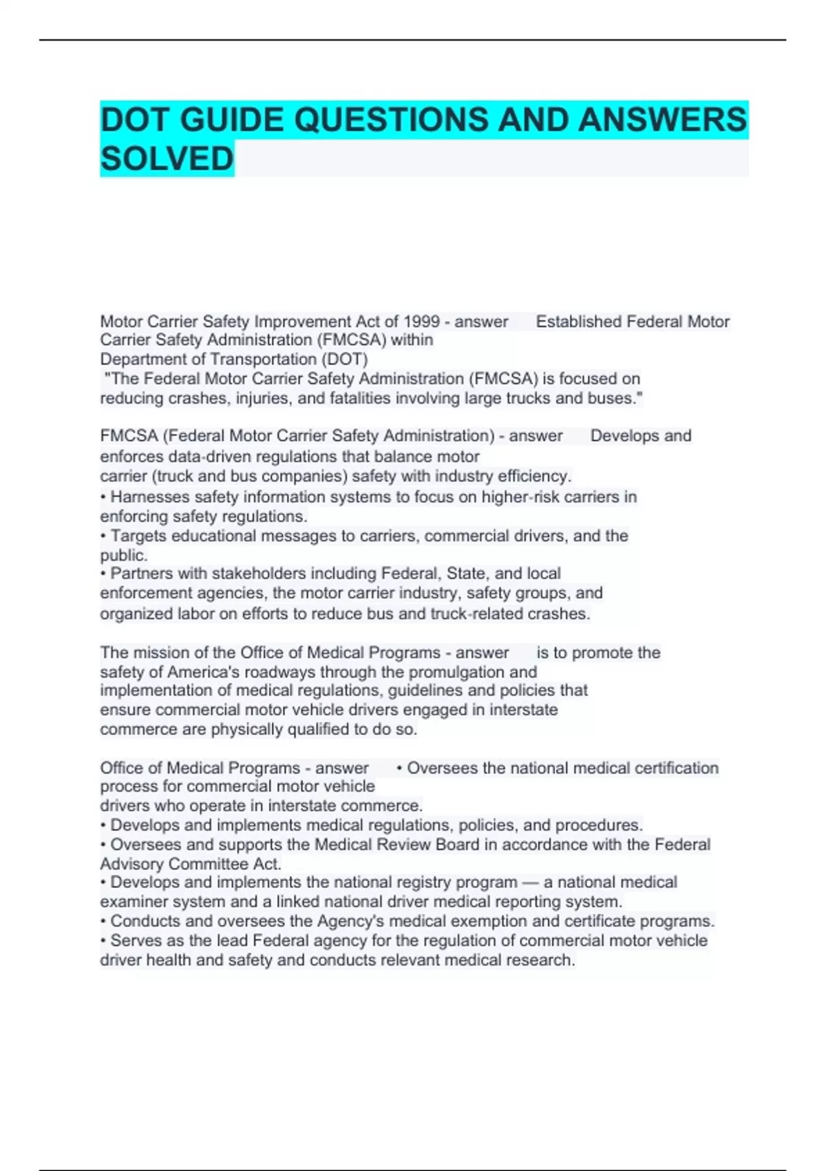 DOT GUIDE QUESTIONS AND ANSWERS SOLVED
