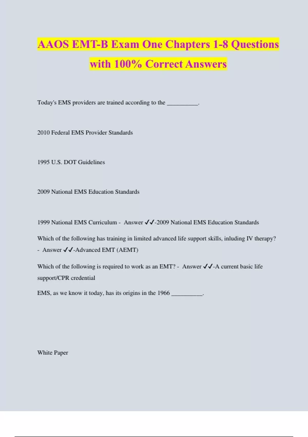 Today's EMS providers are trained according to the __________. 2010 Federal EMS Provider Standards 1995 U.S. DOT Guidelines 2009 National EMS Education Standards 1999 National EMS Curriculum - Answer ️️-2009 National EMS Education Standards Which of the following has training in limited advanced life support skills, including IV therapy? - Answer ️️-Advanced EMT (AEMT)