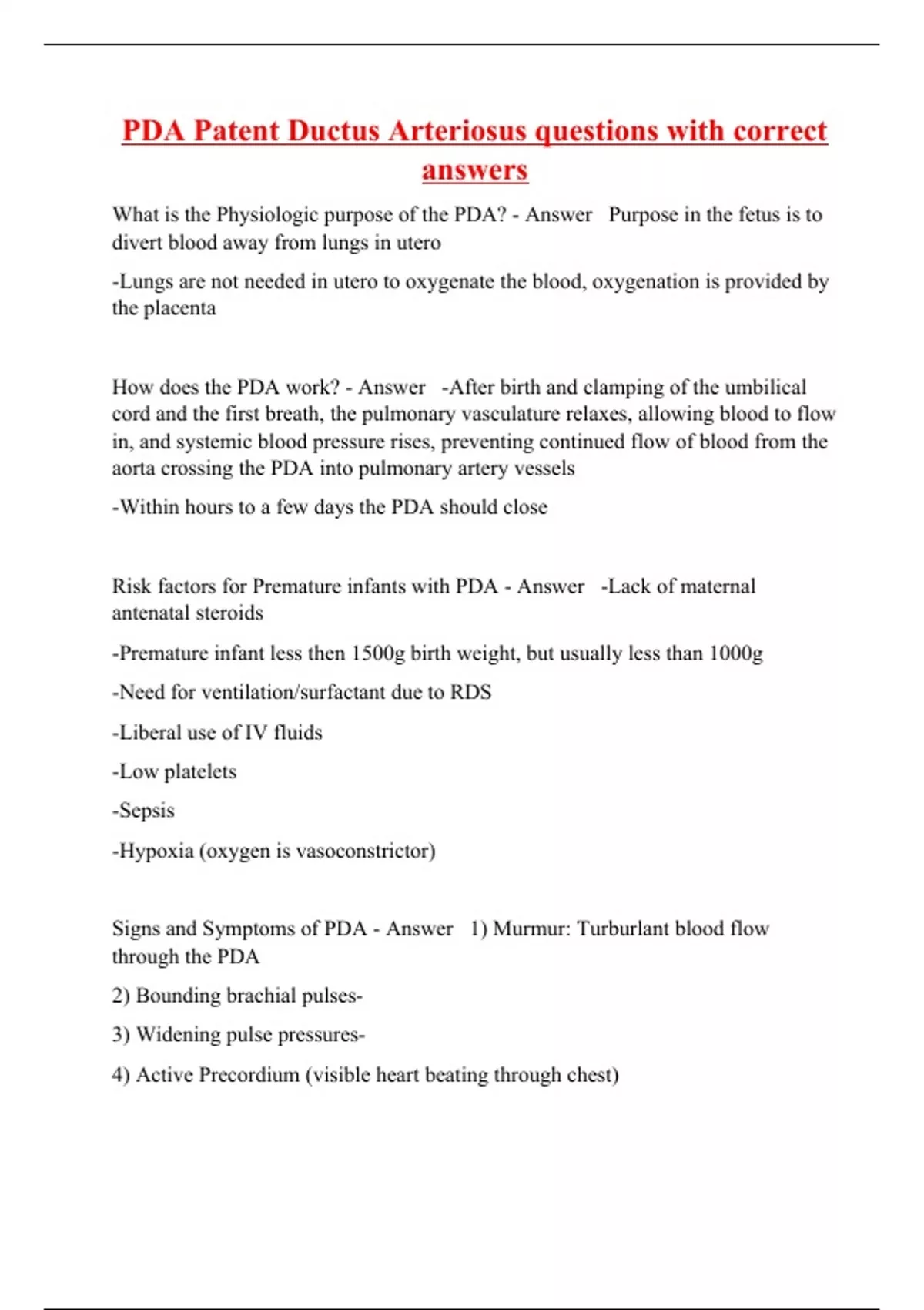 PDA Patent Ductus Arteriosus questions with correct answers