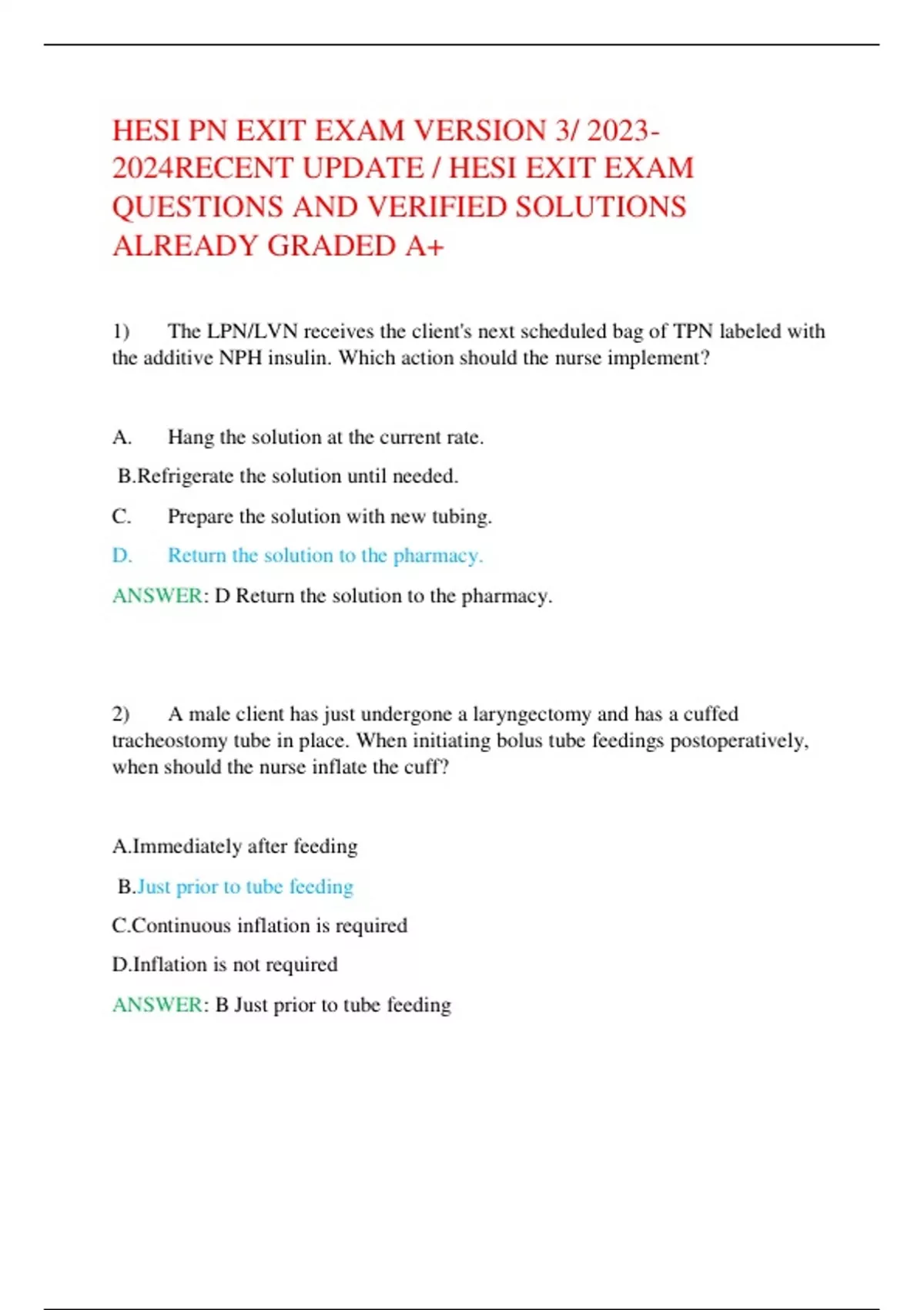 HESI PN EXIT EXAM VERSION 3/ RECENT UPDATE / HESI EXIT EXAM QUESTIONS AND VERIFIED SOLUTIONS ALREADY GRADED A+