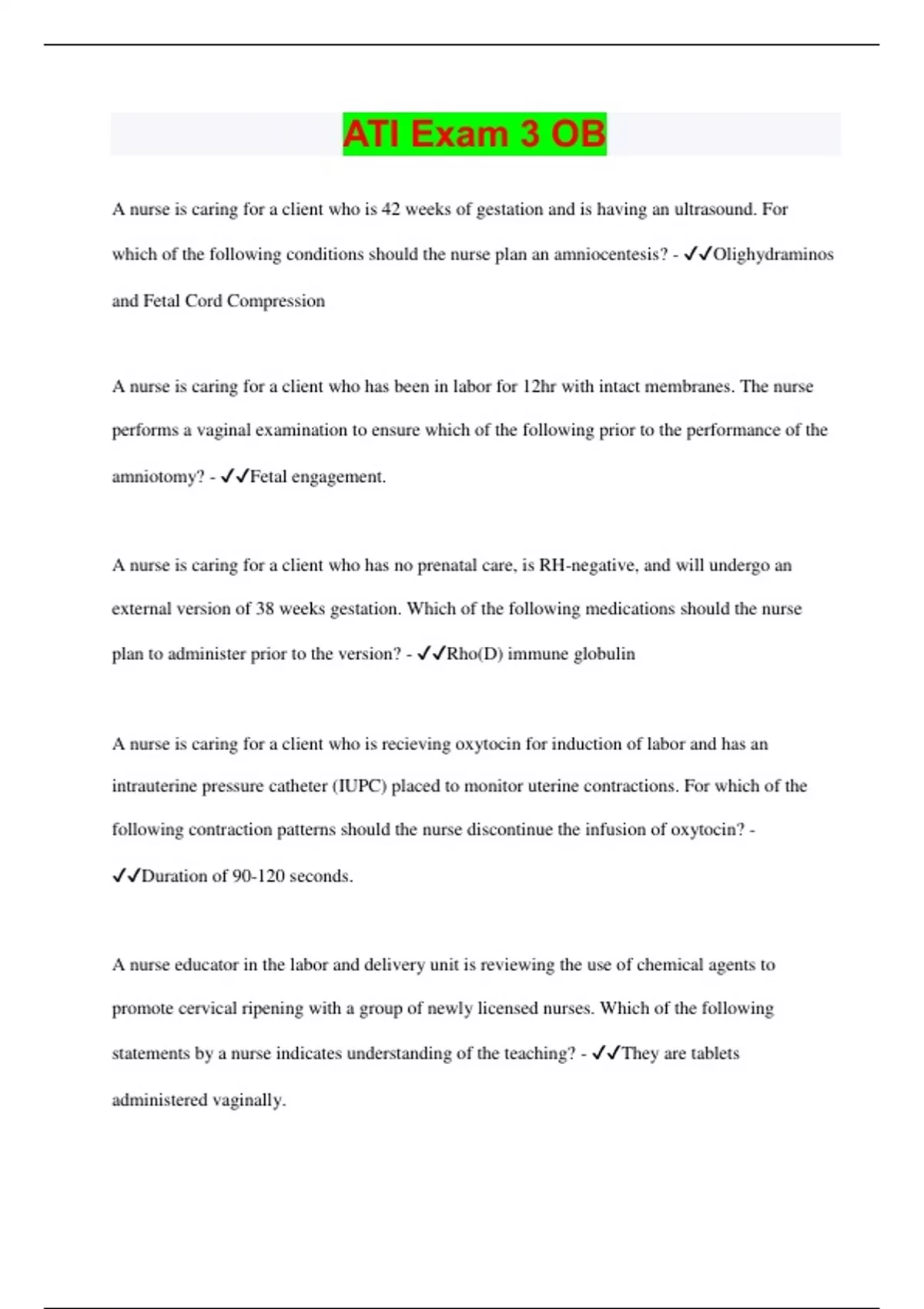 ATI Exam 3 OB Questions with 100% Correct Answers | Latest Update 2024 | Verified