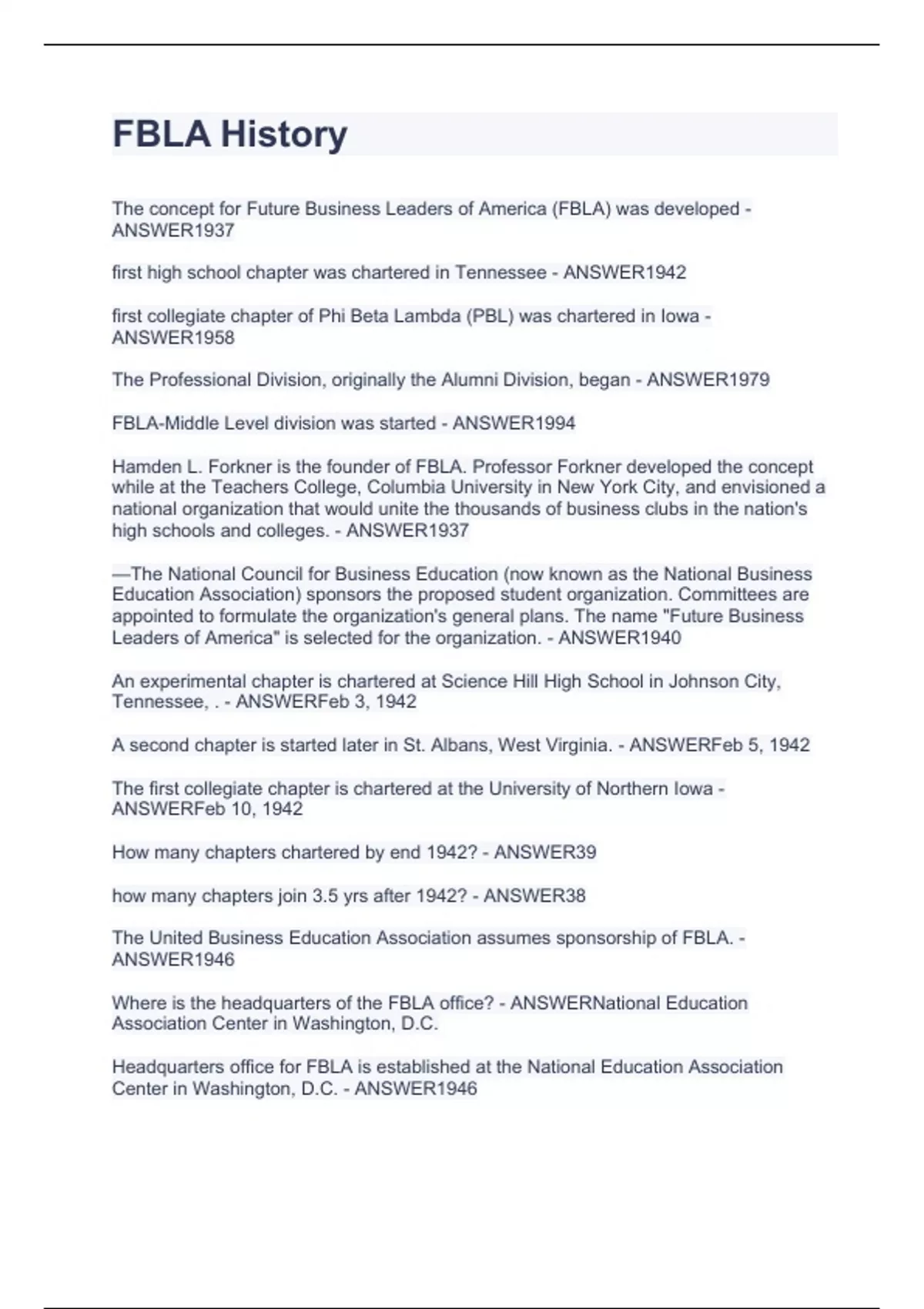Exam of 2 pages for the course FBLA at FBLA (FBLA History.)