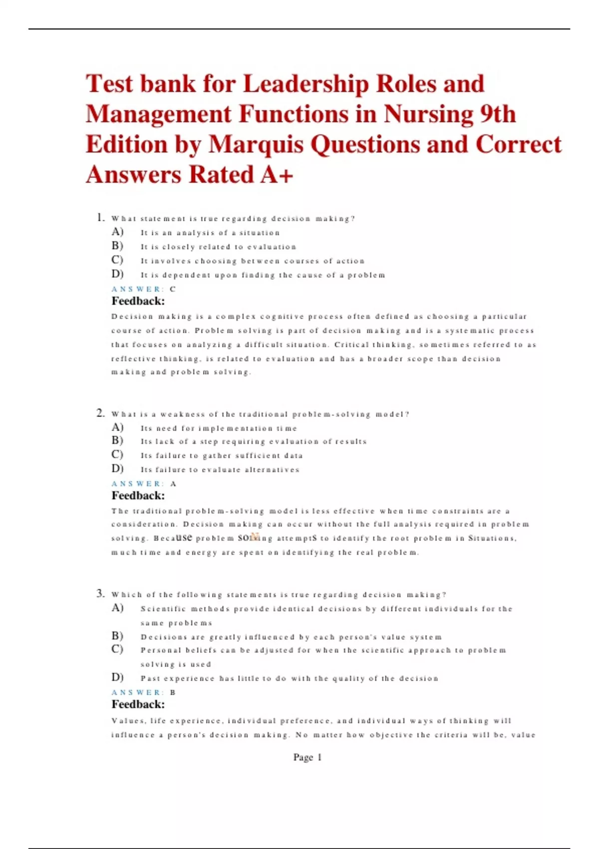 Test bank for Leadership Roles and Management Functions in Nursing 9th Edition by Marquis Questions and Correct Answers Rated A+
