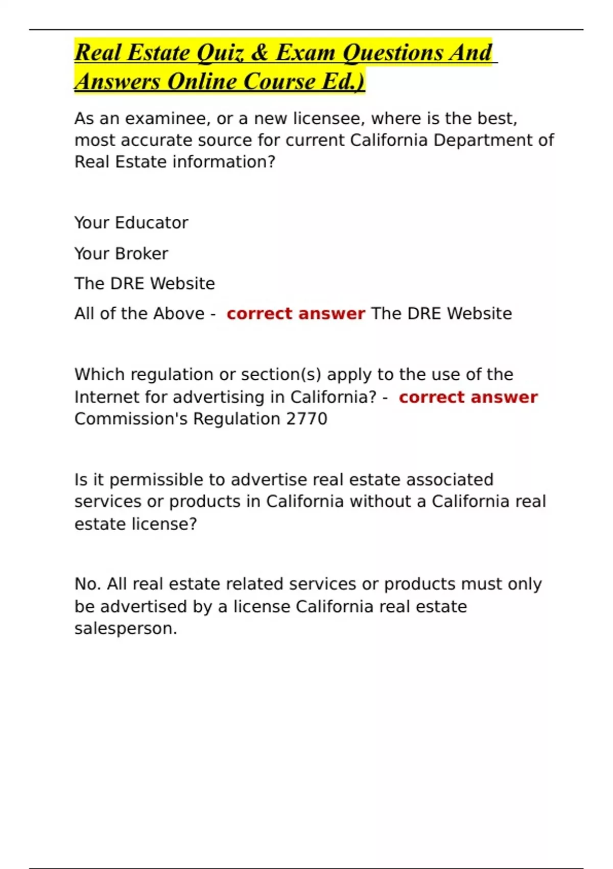Real Estate Quiz & Exam Questions And Answers Online Course Ed.)