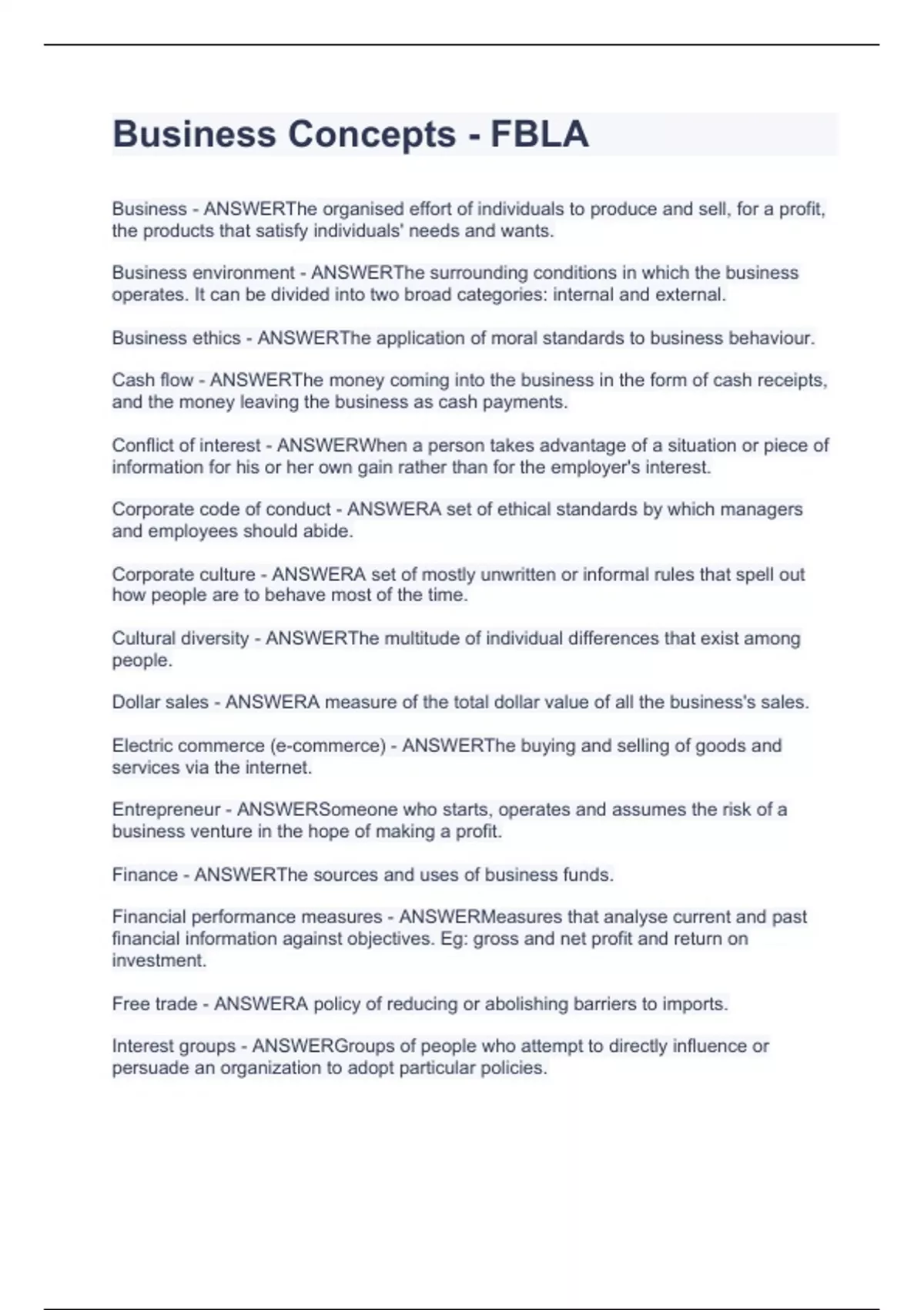 Business Concepts - FBLA.Written exams with questions and answers 2024