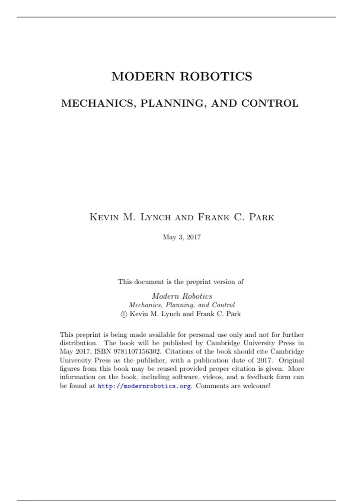 - Modern Robotics Mechanics, Planning, and Control 1