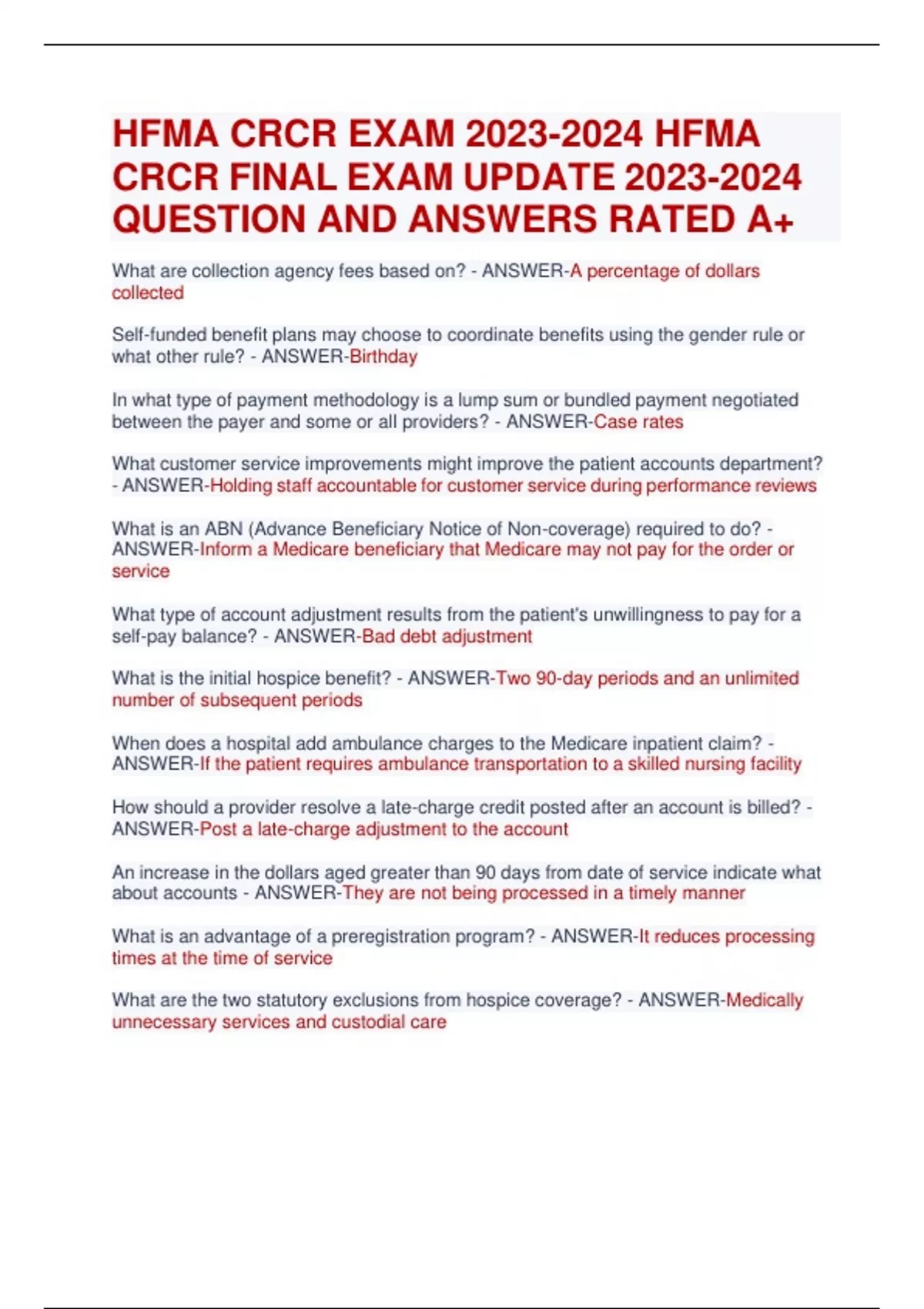 HFMA CRCR EXAM HFMA CRCR FINAL EXAM UPDHFMA CRCR EXAM HFMA CRCR FINAL EXAM UPDATE QUESTION AND ANSWERS RATED A+ATE QUESTION AND ANSWERS RATED A+