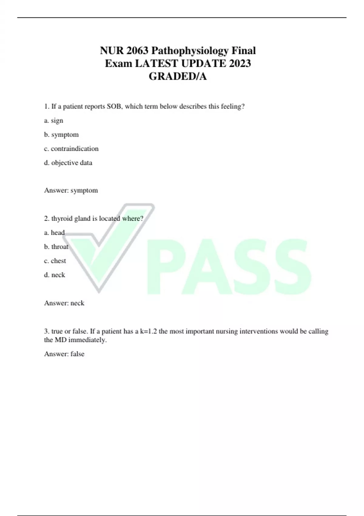 NUR 2063 Pathophysiology Final Exam LATEST UPDATE 2023 GRADED/A 1. If a patient reports SOB, which term below describes this feeling? a. sign b. symptom c. contraindication d. objective data Answer: symptom 2. thyroid gland is located where? a. head b. throat c. chest d. neck Answer: neck 3. true or false. If a patient has a k=1.2 the most important nursing interventions would be calling the MD immediately. Answer: false 4. what is the treatment for hypothyroidism? a. dopamine replacements b. oral insulin medication c. glucose sq d. oral thyroid replacements Answer: oral thyroid replacements 5. A 22 year old male comes to ER with RLQ pain with N&V and diarrhea. The RN know: a. the patient has liver issues b. the patient has appendicitis c. the patient has kidney issues d. the patient has colon cancer Answer: the patient has appendicitis 6. which condition below causes intolerance to heat, diarrhea, and bulging eyes? a. hypothyroidism b. MG c. hyperthyroidism d. parkinsons disease Answer: hyperthyroidism 7. A young honeymooner comes to the clinic with burning with urination & mild fever. The RN knows. a. the patient is incontinent b. the patient has pyelonephritis c. the patient has bladder stones d. the patient has cystits Answer: the patient has cystitis 8. true or false. Air trapping in the alveoli causes a barreled chest. Answer: true 9. calcium imbalances are due to an abnormal functioning of: a. parathyroid glands b. thymus gland c. renal system d. muscle system Answer: parathyroid glands 10. DI causes the patient to grave: a. gravey b. salt c. food d. water Answer: water 11. select all that apply. left sided HF is presented as: a. vein distentio