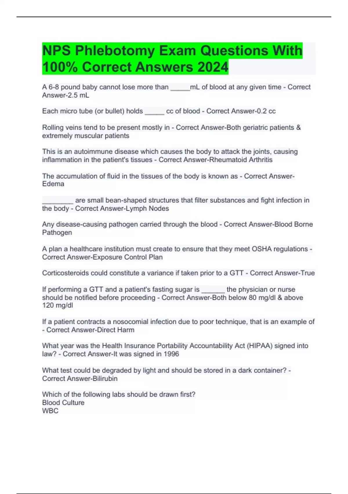 NPS Phlebotomy Exam Questions With 100% Correct Answers 2024