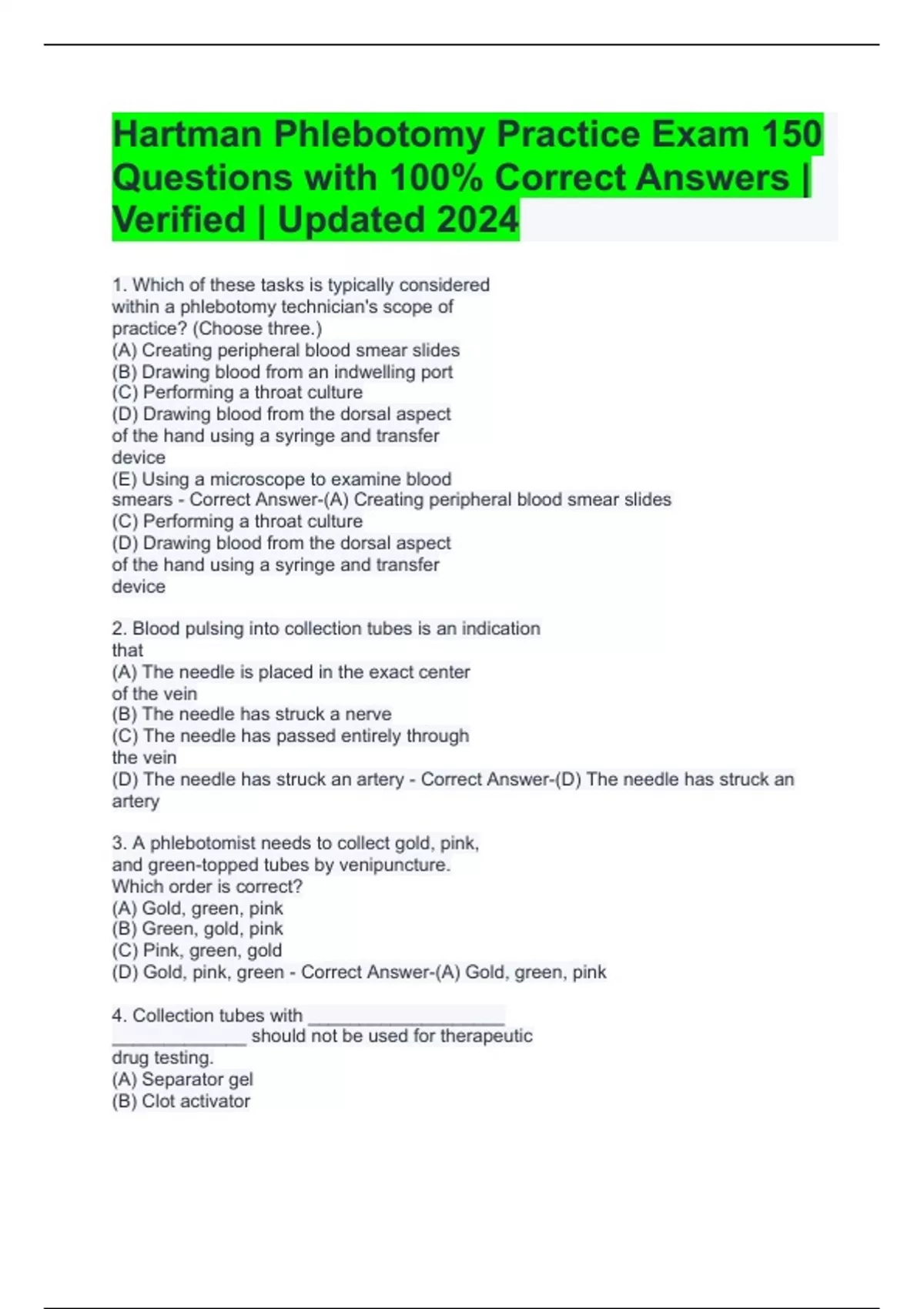 Hartman Phlebotomy Practice Exam 150 Questions with 100% Correct Answers | Verified | Updated 2024