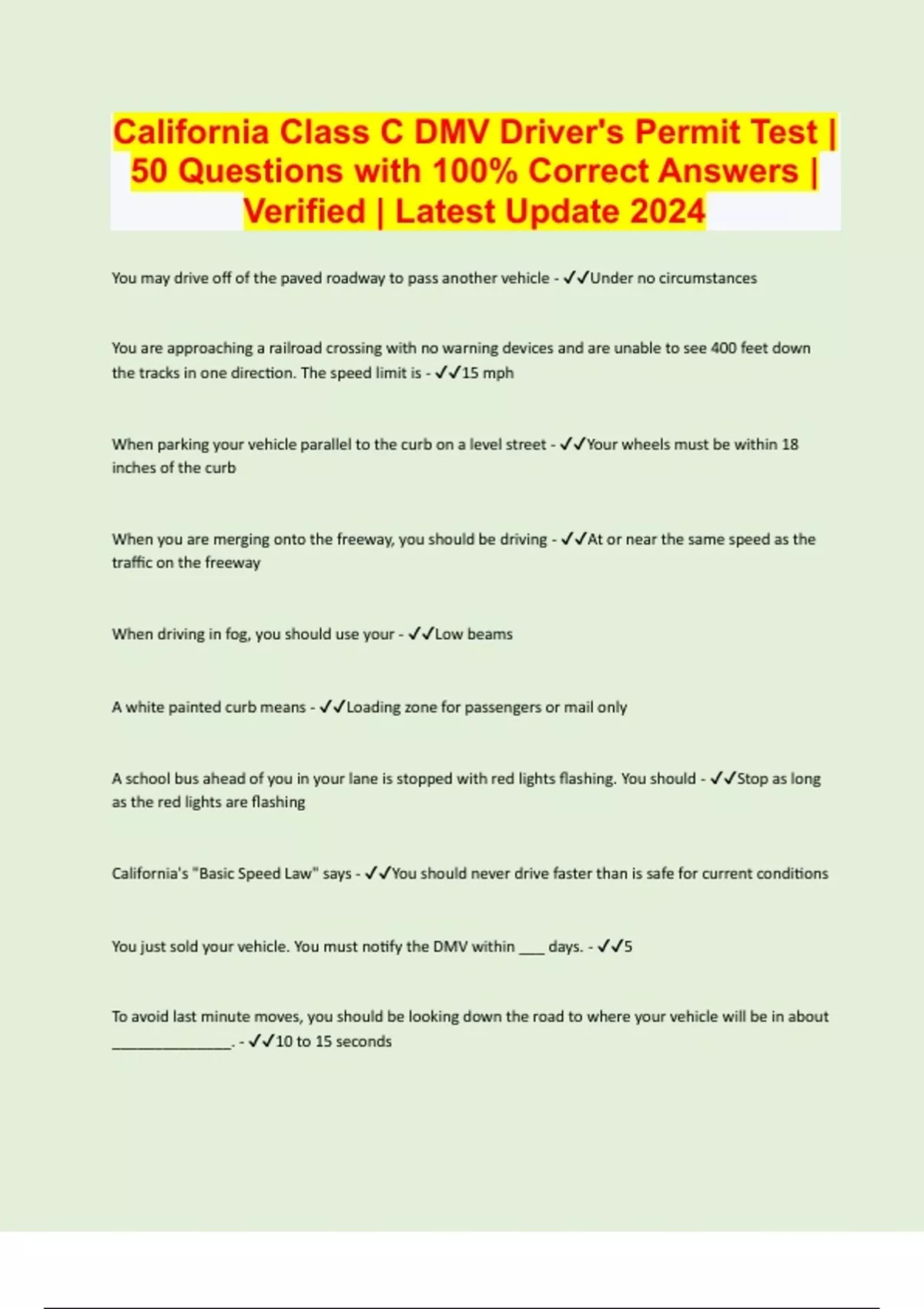 California Class C DMV Driver's Permit Test | 50 Questions with 100% Correct Answers | Verified | Latest Update 2024