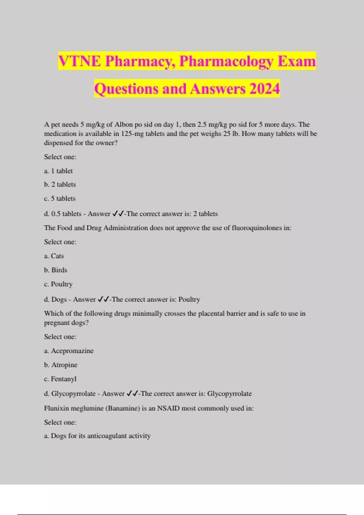 VTNE Pharmacy, Pharmacology Exam Questions and Answers 2024 A pet needs 5 mg/kg of Albon po sid on day 1, then 2.5 mg/kg po sid for 5 more days. The medication is available in 125-mg tablets and the pet weighs 25 lb. How many tablets will be dispensed for the owner? Select one: a. 1 tablet b. 2 tablets c. 5 tablets d. 0.5 tablets - Answer ️️ -The correct answer is: 2 tablets The Food and Drug Administration does not approve the use of fluoroquinolones in: Select one: a. Cats b. Birds c. Poultry d. Dogs - Answer ️️ -The correct answer is: Poultry Which of the following drugs minimally crosses the placental barrier and is safe to use in pregnant dogs? Select one: a. Acepromazine b. Atropine c. Fentanyl d. Glycopyrrolate - Answer ️️ -The correct answer is: Glycopyrrolate Flunixin meglumine (Banamine) is an NSAID most commonly used in: Select one: a. Dogs for its anticoagulant activity b. Horses for the treatment of colic c. Dogs for the treatment of chronic osteoarthritis d. Horses for reducing fever - Answer ️️ -The correct answer is: Horses for the treatment of colic Why should tetracycline use be avoided in pregnant bitches? Select one: a. It may damage the developing pups and may result in liver impairment later in life. b. It may be deposited in dental enamel and give the pup's teeth a mottled yellow appearance. c. It may cause changes in the joint cartilage that may result in arthritis at an older age in the pup. d. It may impair normal central nervous system development in the pups that may show up as behavioral changes later in life. - Answer ️️ -The correct answer is: It may be deposited in dental enamel and give the pup's teeth a mottled yellow appearance. Spike the dog ingested his owner's cardiac medication about a half-hour ago. The veterinarian instructs you to give him an emetic that may be administered into the conjunctival sac, and then flush as necessary. The name of the drug is: Select one: a. Syrup of ipecac b. Apomorphine c. Xylazine d. Hydrogen peroxide - Answer ️️ -The correct answer is: Apomorphine A 16-oz bottle contains how many mL? Select one: a. 40 mL b. 240 mL c. 1.6 mL d. 480 mL - Answer ️️ -The correct answer is: 480 mL What effect are anticholinergic drugs expected to have on the gastrointestinal tract?t Select one: a. Decreased ability of compounds to irritate the bowel wall b. Increased secretions by the bowel c. Decreased bowel motility d. Increased movement of feces through the bowel - Answer ️️ -The correct answer is: Decreased bowel motility Griseofulvin is used in cats, dogs, and horses t