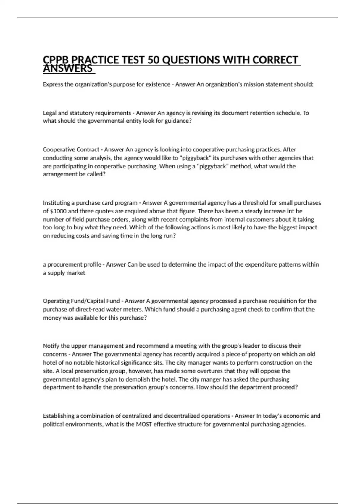 Express the organization's purpose for existence - Answer An organization's mission statement should: Legal and statutory requirements - Answer An agency is revising its document retention schedule. To what should the governmental entity look for guidance? Cooperative Contract - Answer An agency is looking into cooperative purchasing practices. After conducting some analysis, the agency would like to "piggyback" its purchases with other agencies that are participating in cooperative purchasing. When using a "piggyback" method, what would the arrangement be called? Instituting a purchase card program - Answer A governmental agency has a threshold for small purchases of $1000 and three quotes are required above that figure. There has been a steady increase int he number of field purchase orders, along with recent complaints from internal customers about it taking too long to buy what they need. Which of the following actions is most likely to have the biggest impact on reducing costs and saving time in the long run? a procurement profile - Answer Can be used to determine the impact of the expenditure patterns within a supply market Operating Fund/Capital Fund - Answer A governmental agency processed a purchase requisition for the purchase of direct-read water meters. Which fund should a purchasing agent check to confirm that the money was available for this purchase? Notify the upper management and recommend a meeting with the group's leader to discuss their concerns - Answer The governmental agency has recently acquired a piece of property on which an old hotel of no notable historical significance sits. The city manager wants to perform construction on the site. A local preservation group, however, has made some overtures that they will oppose the governmental agency's plan to demolish the hotel. The city manger has asked the purchasing department to handle the preservation group's concerns. How should the department proceed? Establishing a combination of centralized and decentralized operations - Answer In today's economic and political environments, what is the MOST effective structure for governmental purchasing agencies. Remind the requester of the code restrictions on fragmenting orders - Answer A governmental agency has a non-competition threshold that says any purchase below $5,000 does not require competition. Over a three month period a requesting user has asked a 3 separate occasions to directly purchase without competition, products needed by the agency. On each occasion the value of the purchase was approximately $4,500. What should the buyer do? Market analysis - Answer A buyer is charged with purchasing diesel fuel for the transit system. What type of study should be conducted to determine how best to make this purchase? Determine if the item is available in surplus stock - Answer Upon receipt a Purchase Requisition for a small buy commodity, the first step the buyer would normally take would be to: Plan the change in detail so that it can be implemented in a 30-day period - Answer The government agency is changing its performance measures from primarily cost related measures to value-added benefits. To implement this change, the agency would want to consider all of the following steps EXCEPT? Cost Analysis - Answer A buyer is asked to conduct a review and evaluation of cost data in order to determine actual costs or estimates of costs to be incurred. This process is known as: Many lease agreements will not permit modifications of any kind to the leased equipment - Answer An agency manager submitted a request for five-year lease on a special tractor that he plans to modify and use for raking the beach during the summer. He has money in his budget to cover the lease cost. What's the most important thing to consider before going forward with the leasing process? County Chief Property Tax Assessor - Answer A communications director, procurement specialist and budget specialist have all been added to an acquisition planning team to procure a new countywide communications system. In addition to the team already assembled,which of the following would NOT be included on this acquisition planning team? Call the recommended vendor for prices - Answer A governmental agency has issued a purchase requisition to to acquire software for its finance department. Immediately upon receiving the requisition, the buyer should do all the following EXCEPT which task?
