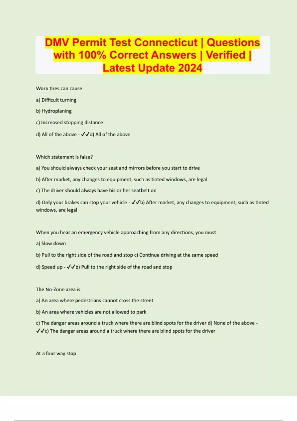 DMV Permit Test Connecticut | Questions with 100% Correct Answers | Verified | Latest Update 2024