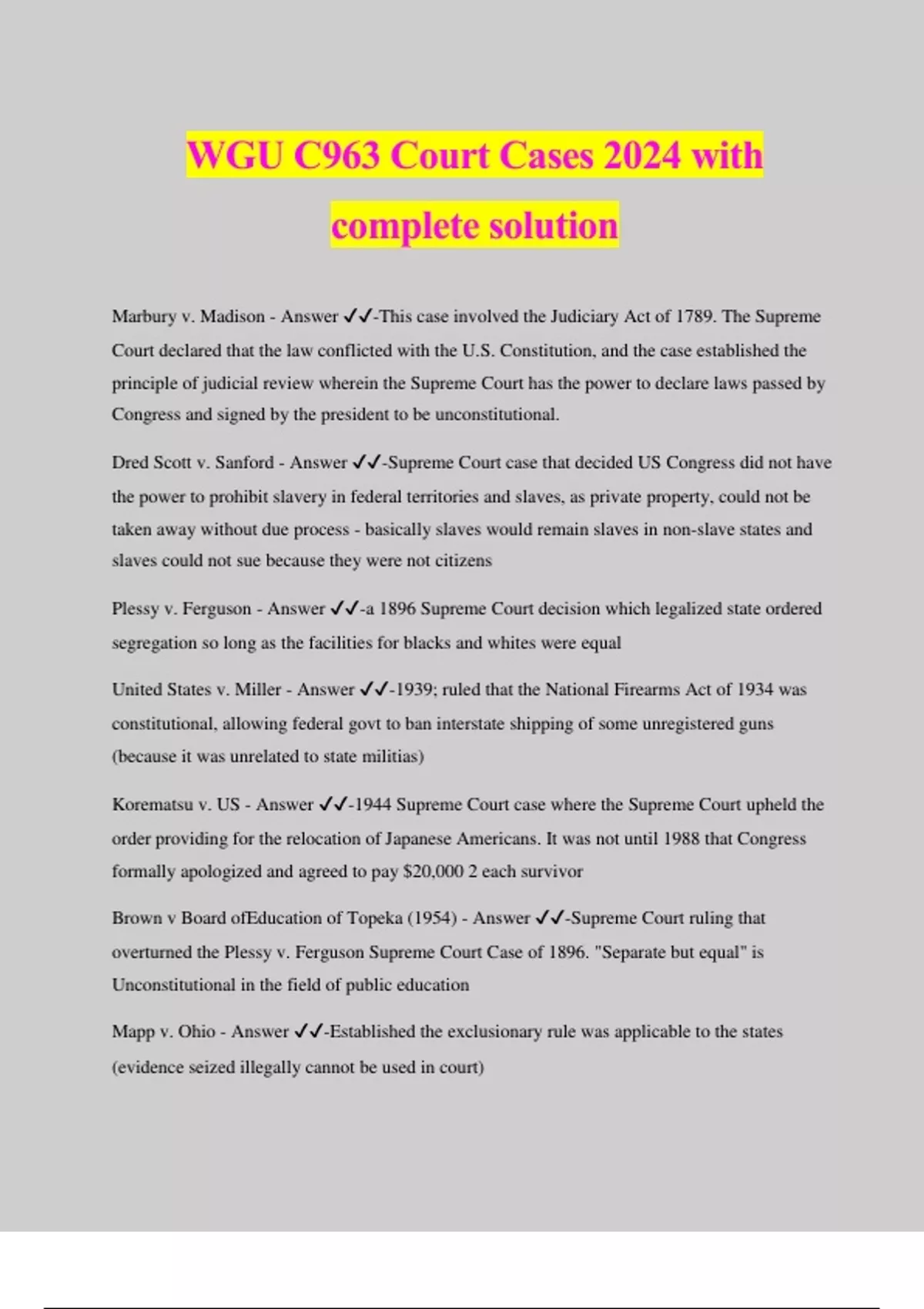 WGU C963 Court Cases 2024 with complete solution Marbury v. Madison - Answer ️️ -This case involved the Judiciary Act of 1789. The Supreme Court declared that the law conflicted with the U.S. Constitution, and the case established the principle of judicial review wherein the Supreme Court has the power to declare laws passed by Congress and signed by the president to be unconstitutional. Dred Scott v. Sanford - Answer ️️ -Supreme Court case that decided US Congress did not have the power to prohibit slavery in federal territories and slaves, as private property, could not be taken away without due process - basically slaves would remain slaves in non-slave states and slaves could not sue because they were not citizens Plessy v. Ferguson - Answer ️️ -a 1896 Supreme Court decision which legalized state ordered segregation so long as the facilities for blacks and whites were equal United States v. Miller - Answer ️️ -1939; ruled that the National Firearms Act of 1934 was constitutional, allowing federal govt to ban interstate shipping of some unregistered guns (because it was unrelated to state militias) Korematsu v. US - Answer ️️ -1944 Supreme Court case where the Supreme Court upheld the order providing for the relocation of Japanese Americans. It was not until 1988 that Congress formally apologized and agreed to pay $20,000 2 each survivor Brown v Board ofEducation of Topeka (1954) - Answer ️️ -Supreme Court ruling that overturned the Plessy v. Ferguson Supreme Court Case of 1896. "Separate but equal" is Unconstitutional in the field of public education Mapp v. Ohio - Answer ️️ -Established the exclusionary rule was applicable to the states (evidence seized illegally cannot be used in court)